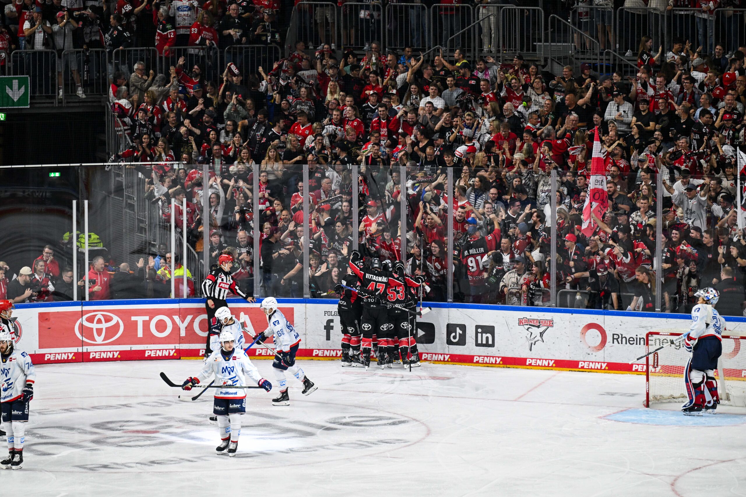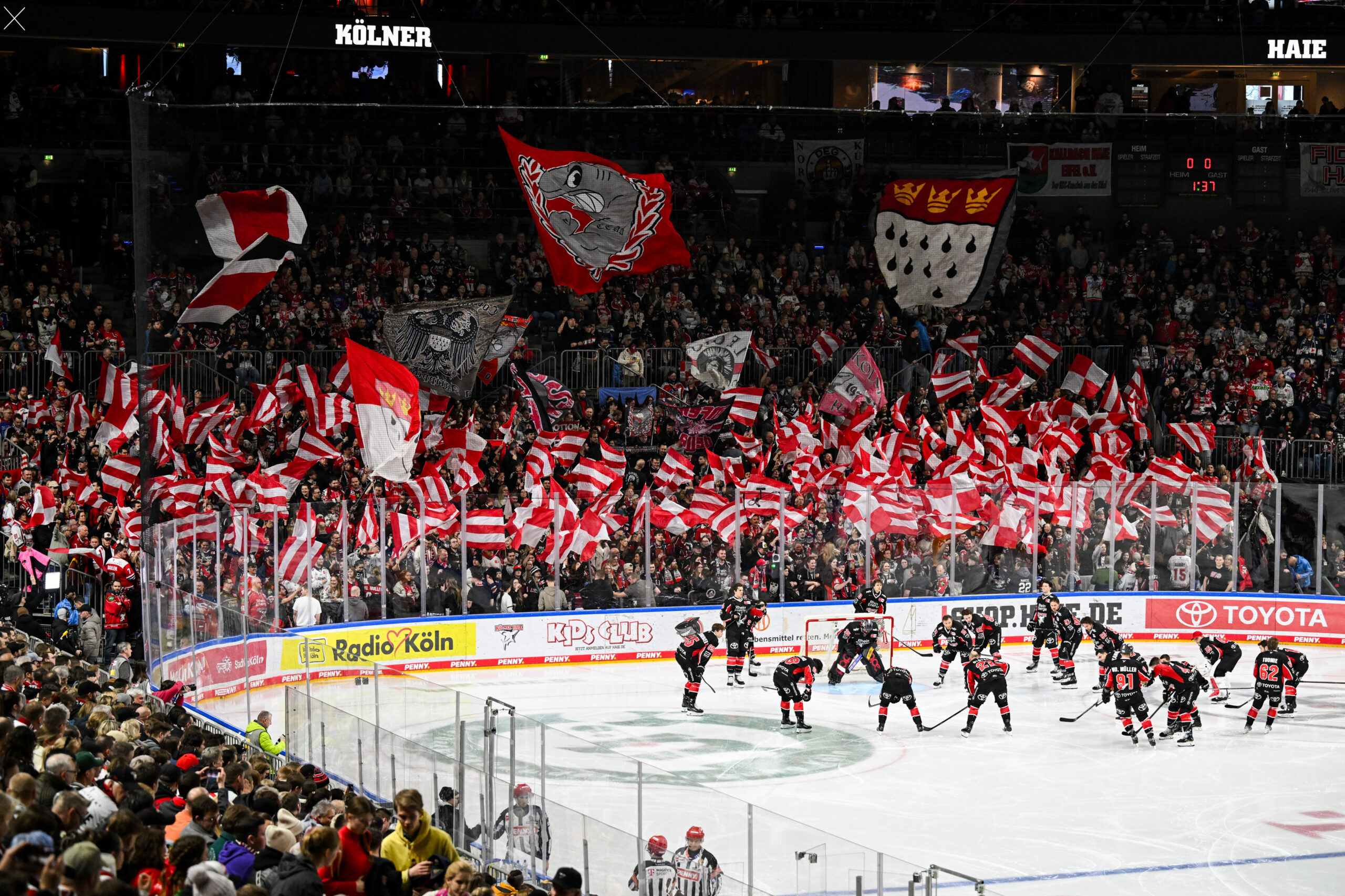 Im ersten Saisonspiel trafen wir an einem Freitagabend vor ausverkaufter LANXESS arena auf die Eisbären Berlin, mit denen sich unsere Wege in der Saison noch öfter kreuzten werden, doch dazu später mehr. Die Eisbären erwiesen sich in Spiel eins als zu stark und gewannen 2:6 – eine richtig schöne Geschichte hatte die Partie dann aber doch parat, denn Junghai Marco Münzenberger erzielte kurz vor Schluss als 19-Jähriger in seinem ersten PENNY DEL-Spiel seinen ersten Treffer, den das Haifischbecken entsprechend bejubelte. Zwei Tage später trafen wir vor über 16.000 Zuschauern auf die Adler Mannheim und konnten das Spiel mit 3:1 für uns entscheiden – es war der erste von 37 Erfolgen, die wir zusammen mit euch an unserer Seite in dieser Spielzeit feiern sollten.