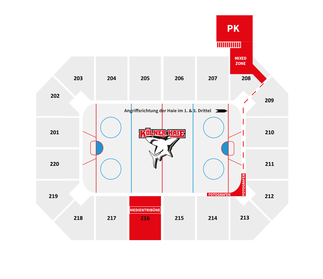 Die Pressetribüne in der LANXESS arena befindet sich im Block 216 in den Reihen 9 und 10. Vom Presse-Eingang haben Sie unmittelbaren Zugang zum Block 216 und der Pressetribüne.