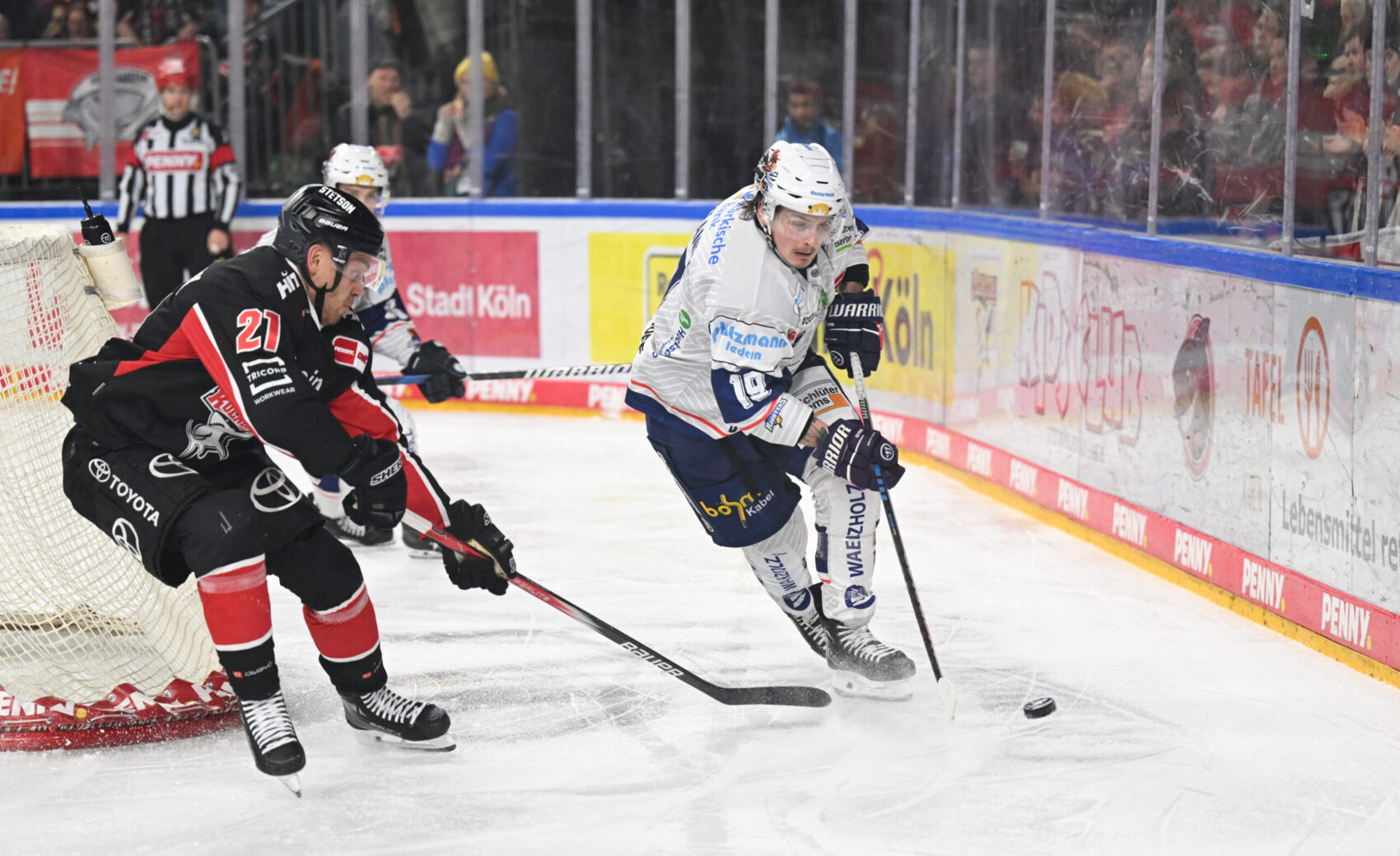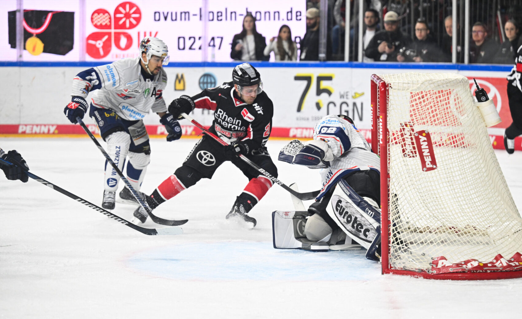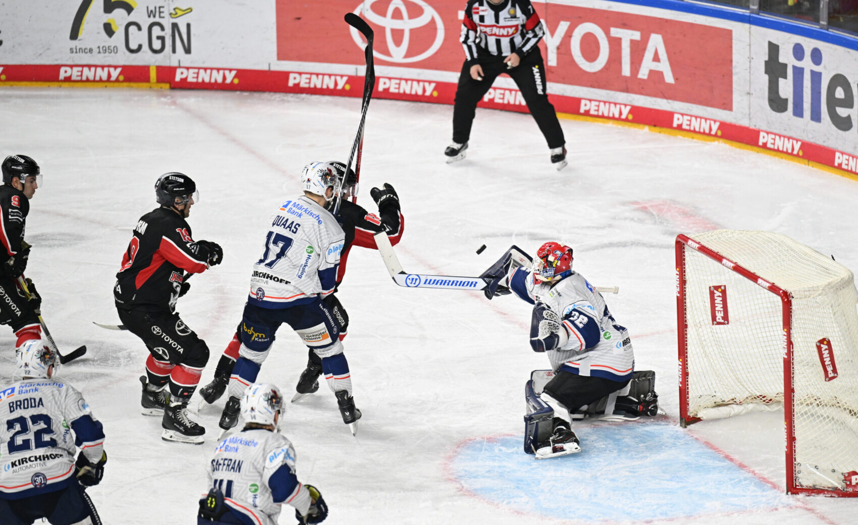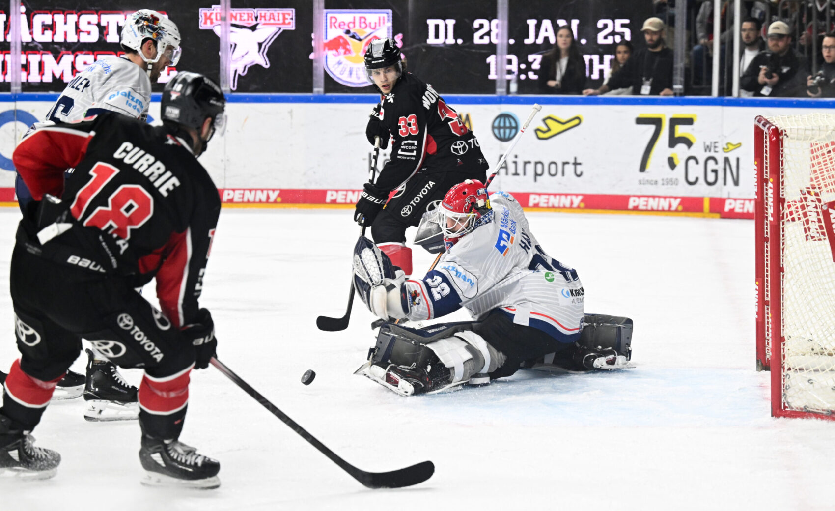 Die erste gute Chance vor 18.600 Zuschauern in der ausverkauften LANXESS arena gehörte unserer Mannschaft. Parker Tuomie fuhr mit ordentlich Tempo von rechts in die gegnerische Zone und legte dann quer in den Slot auf Justin Schütz. Der nahm die Scheibe kurz an, legte sie sich auf die Rückhand, scheiterte mit seinem Versuch aber am stark reagierenden Hendrik Hane im Iserlohner Kasten.