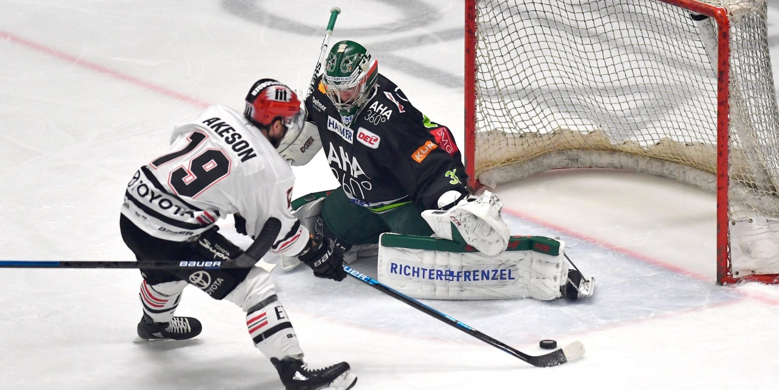 Noch in Unterzahl müssen die Haie mit der ersten echten Tormöglichkeit der Gastgeber gleich das 1:0 hinnehmen (22.). Nach einem Kölner Missverständnis im Angriffsdrittel taucht Sahir Gill plötzlich frei vor Hannibal Weitzmann auf und vollendet gekonnt per Rückhand. Aber der KEC zeigt sich kaum beeindruckt und erarbeitet sich seinerseits Chancen. Doch Ben Hanowski (22.) und Freddie Tiffels (27.) scheitern jeweils am starken Roy. Da aber auch die Panther im Mittelabschnitt offensiv mit mehr Tempo unterwegs sind, ist die Partie jetzt deutlich ausgeglichener. Und dann nutzen auch die Haie erstmals am heutigen Nachmittag ihr Powerplay: Jason Akeson nagelt den Puck nach Pass von Taylor Aronson über die Fanghand von Roy zum 1:1 in den Winkel (36.). Mit seinem neunten Saisontreffer sorgt der Haie-Stürmer für den verdienten Ausgleich. Aber es bleibt nicht beim Unentschieden: Denn Augsburgs Matthew Fraser bekommt den Puck von der KEC-Defensive „serviert“ und trifft über die Fanghand von Weitzmann hinweg zur 2:1-Führung (39.). Danach passiert im Mittelabschnitt nichts zählbares mehr und so gehen die Haie mit einem knappen Rückstand ins letzte Drittel der Saison.