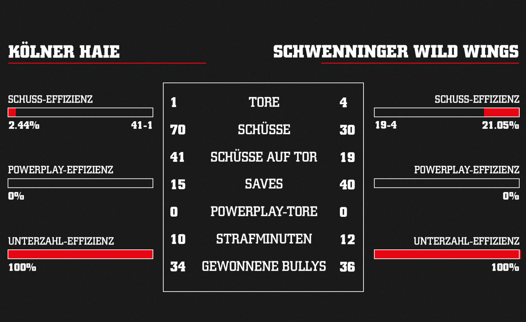 Im Heimspiel gegen die Schwenninger Wild Wings kassieren die Haie eine 1:4-Niederlage. Der 1:3-Anschlusstreffer im letzten Drittel von Brady Austin kommt zu spät. Die Gäste erweisen sich in einem engen Spiel als defensiv robust, offensiv effizient und können sich auf einen starken Torwart verlassen.