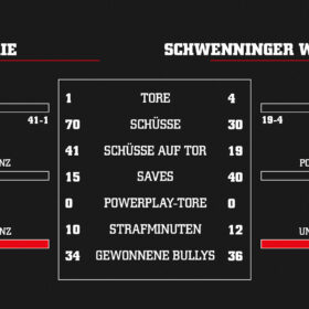 - Fünf und fünf macht zehn: John Matsumoto und Moritz Müller feuerten jeweils fünfmal auf das Schwenninger Tor und zeigten sich für zehn der insgesamt 43 Schüsse verantwortlich.