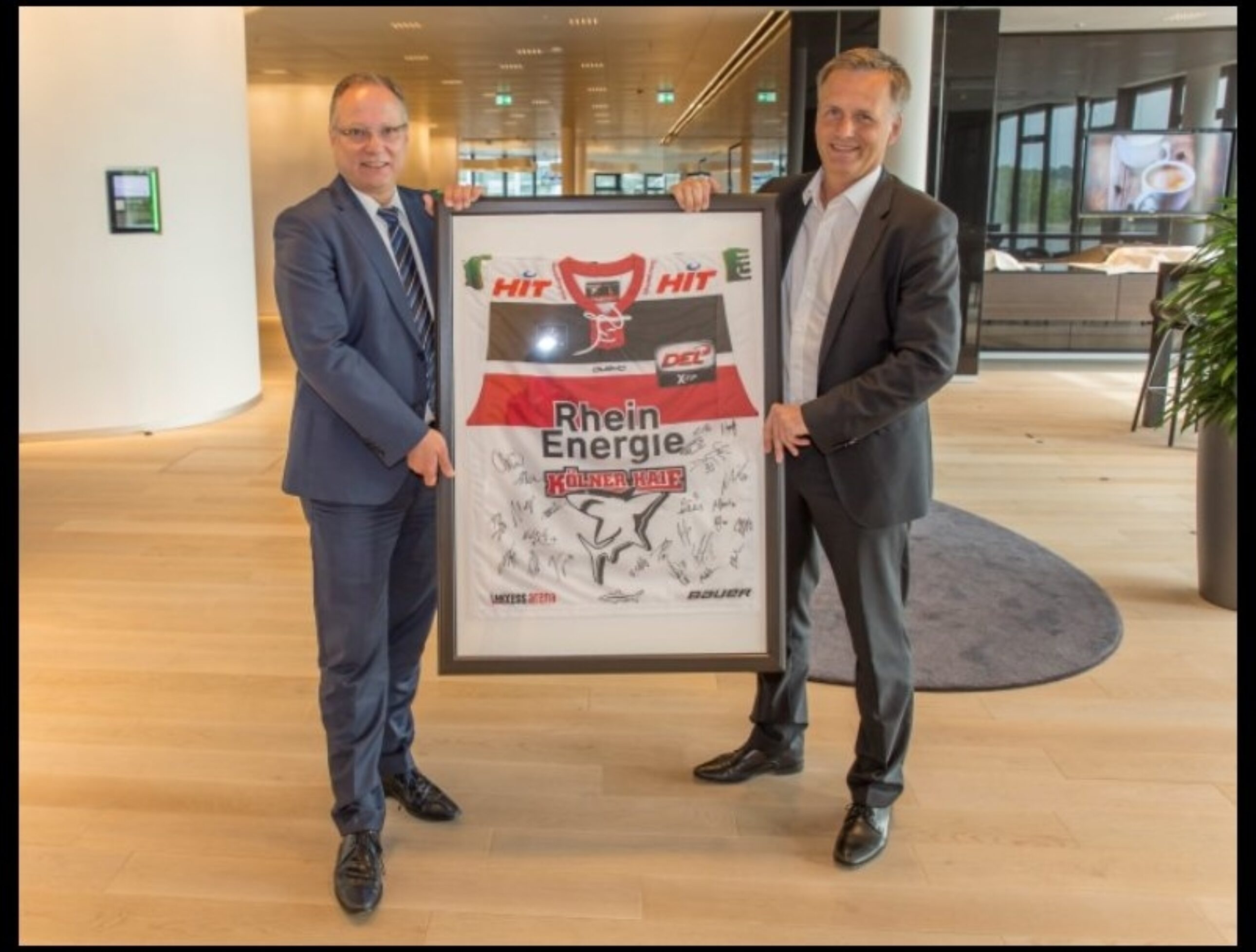 „Die RheinEnergie ist unser gröter Partner. Wir freuen uns sehr und sind dankbar, dass unser Hauptsponsor weiterhin so engagiert dazu beiträgt, den Eishockeystandort Köln zu sichern und erfolgreichen Spitzen- und Nachwuchssport zu ermöglichen“, so Haie-Geschäftsführer Peter Schönberger, der zur symbolischen Trikotübergabe an Norbert Graefrath, den Personalvorstand und Arbeitsdirektor der RheinEnergie ins Hauptgebäude des Haie-Partners zum Kölner Parkgürtel kam.