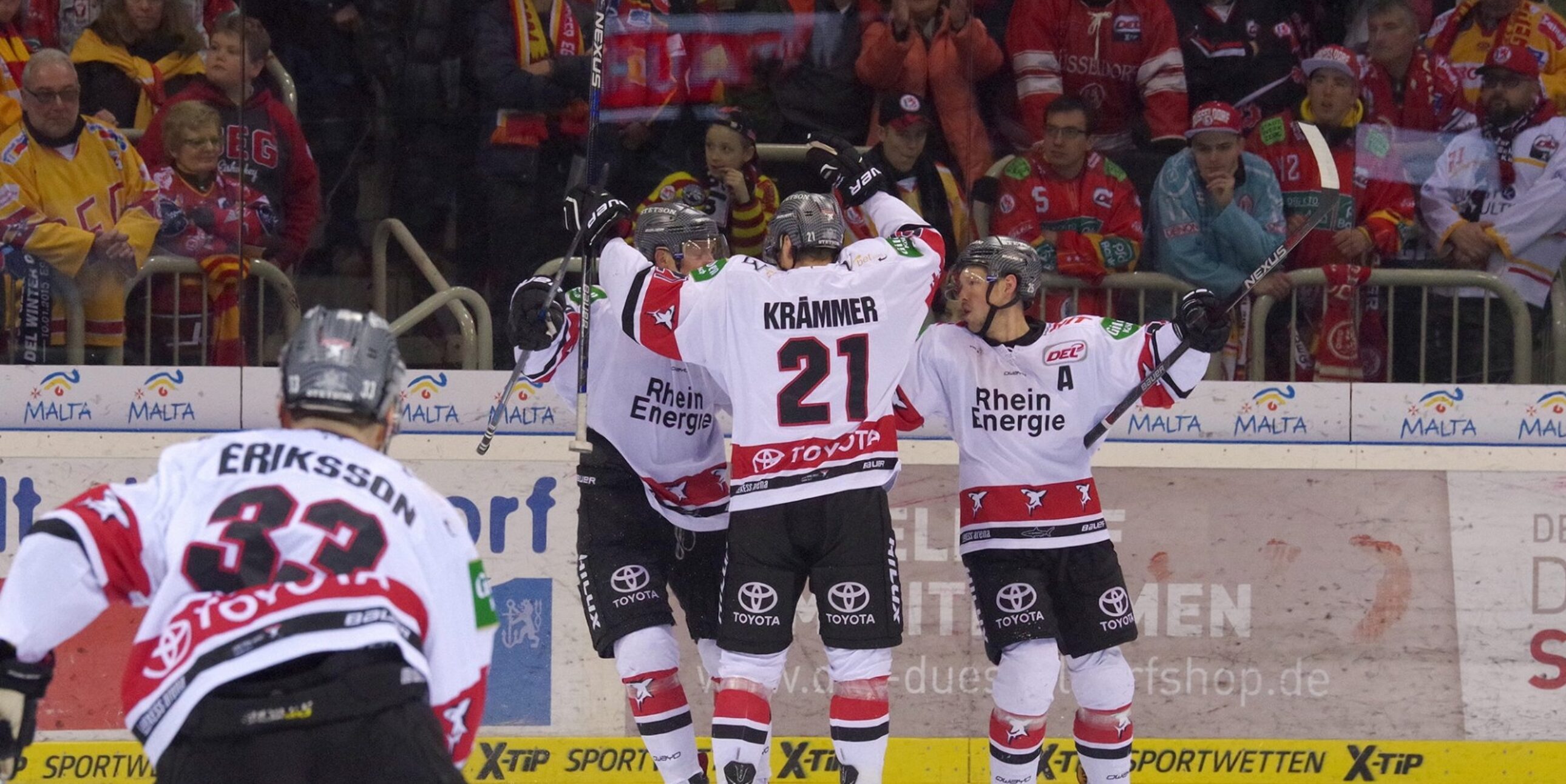Der Spielverlauf: Im ersten Drittel erspielten sich die Haie schnell ein Chancenplus. Alexander Sulzer (6.) und Max Reinhart (8.) hatten jedoch Pech und trafen nur Metall. Beide Teams lieen zudem eine doppelte Überzahl-Möglichkeit ungenutzt. So ging es ohne Tore in die erste Pause. Ähnliches ereignete sich im Mittelabschnitt: Johannes Salmonsson vergab zunächst einen Penalty, obwohl er den DEG-Keeper bereits ausgespielt hatte (22.), Christian Ehrhoff (25.) und Sebastian Uvira (27.) trafen erneut nur den Pfosten. Dann belohnten sich die Haie endlich: In der 34. Minute leitete Gustaf Wesslau mit einem Pass auf Philip Gogulla einen Angriff ein. Der Haie-Stürmer lief links durch und passte quer zu Nico Krämmer, der per Direktschuss unter die Latte traf. 1:0 Haie. In Überzahl dann Treffer Nummer zwei des KEC: Mit einem trockenen Schuss von der blauen Linie tunnelte Fredrik Eriksson DEG-Goalie Mathias Niederberger zum 2:0 (38.). Im dritten Drittel konnte der KEC dann eigene Powerplay-Möglichkeiten nicht nutzen, schluckte aber dafür in Unterzahl den Anschlusstreffer durch Düsseldorfs Maxi Kammerer (50.). Die Schlussoffensive der Gastgeber überstanden die Haie dann aber unbeschadet und konnten den ersten Derby-Sieg 2016/17 bejubeln.