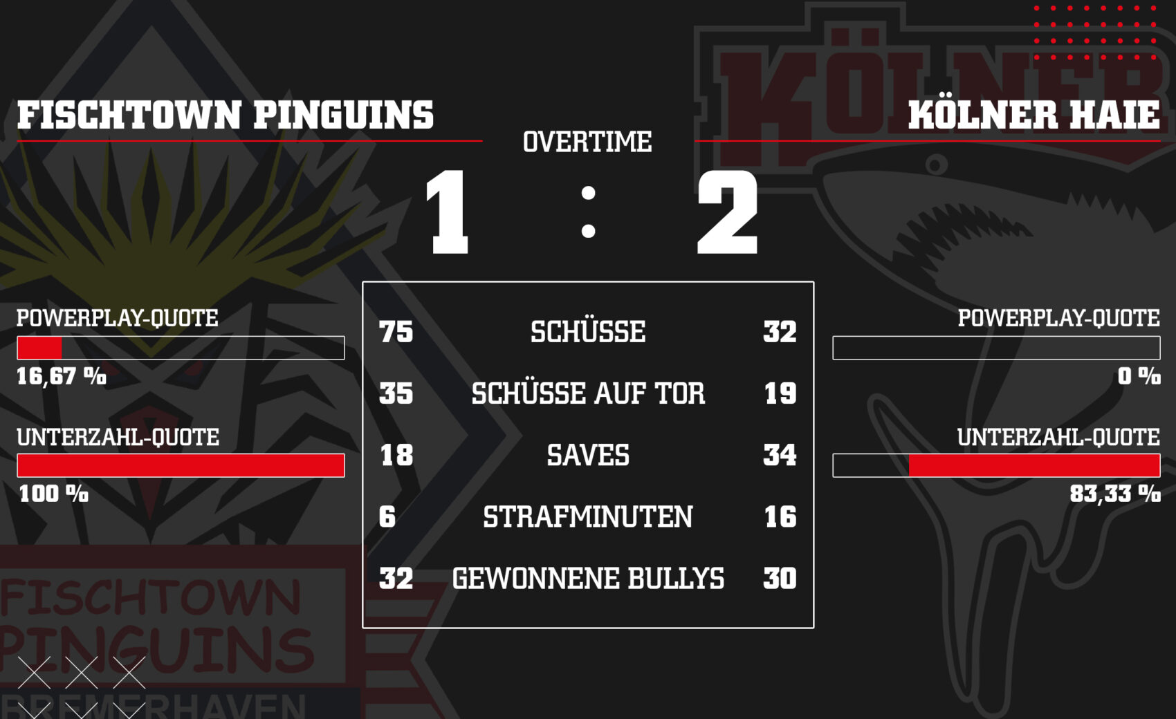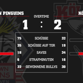 So lässt sich ein Wochenende doch starten! Wir gewinnen unser Auswärtsspiel im hohen Norden bei den Fischtown Pinguins Bremerhaven dank eines Treffers in der Verlängerung von Justin Schütz mit 2:1 und nehmen zwei wichtige Punkte mit nach Köln. Beim starken Tabellenführer sind wir über die komplette Spielzeit gefordert, werfen defensiv alles rein und können uns in den entscheidenden Momenten auf einen starken Tobias Ancicka im Tor verlassen.
