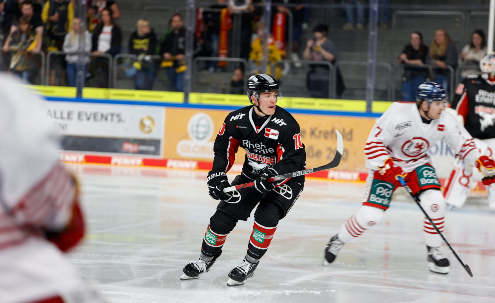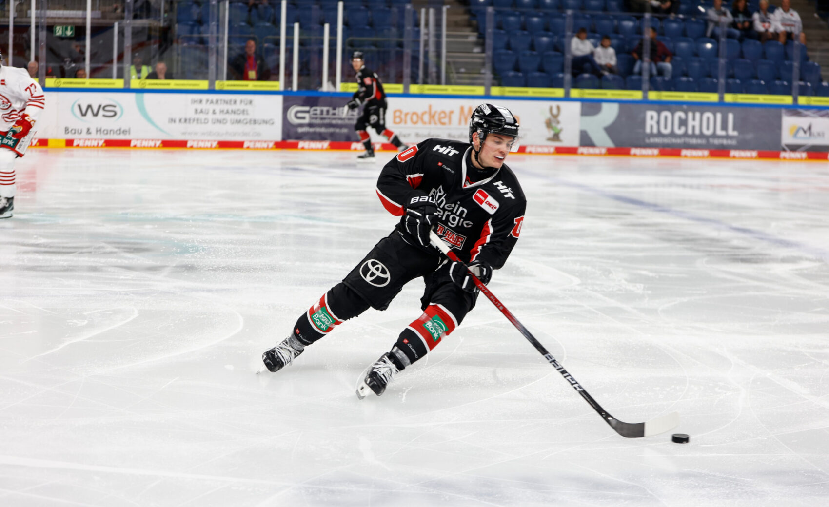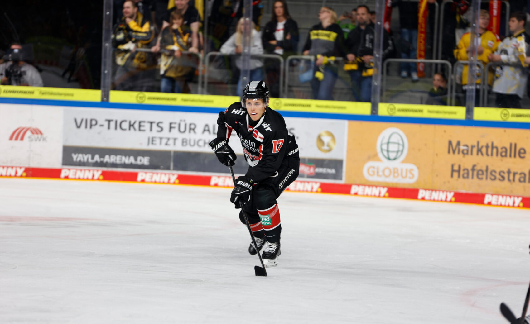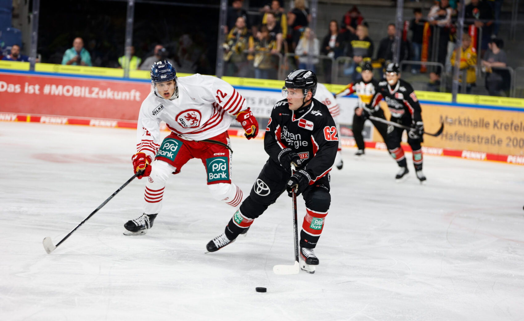Unser Team startete vor gut 2.000 Zuschauern in der Krefelder YAYLA Arena sehr gut in die Partie und spielte von Anfang an mit viel Tempo – die Folge? Zwei frühe Tore. Gregor MacLeod (nach Vorarbeit Jan Luca Sennhenns) sowie Louis-Marc Aubry (nach Vorarbeit Maxi Kammerers und Parker Tuomies) sorgten mit einem Doppelpack in der vierten Minute für die frühe Führung. In der Folgezeit hatten wir im ersten Abschnitt durch Nick Bailen, Kammerer und Justin Schütz weitere gute Möglichkeiten, um einen dritten Treffer nachzulegen, doch es sollte beim 2:0 nach 20 Minuten bleiben.