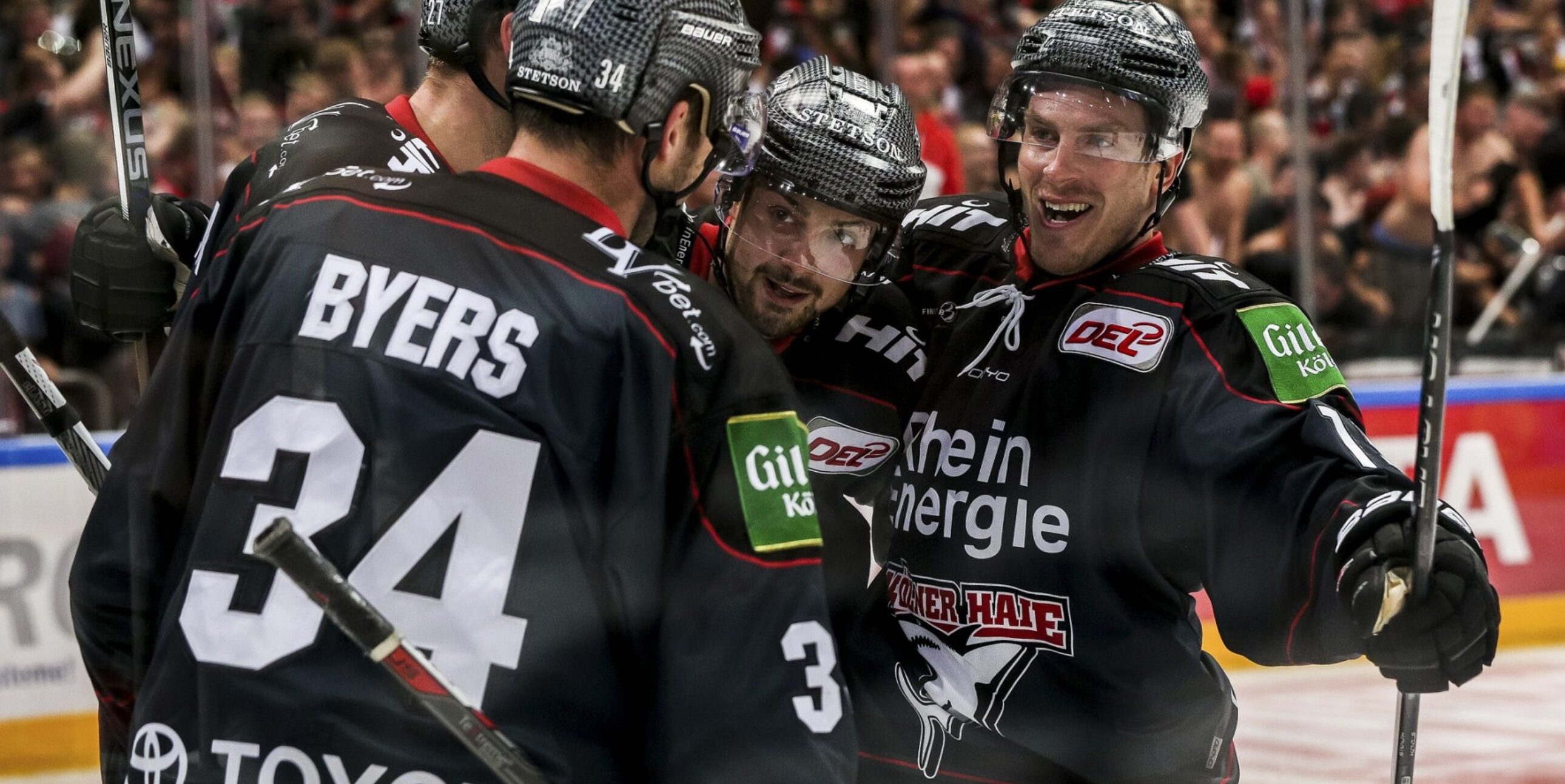 Shawn Lalonde, Ryan Jones und Nico Krämmer treffen beim Haie-Sieg gegen den EHC Red Bull München vom über 17.000 Zuschauern in der LANXESS arena.