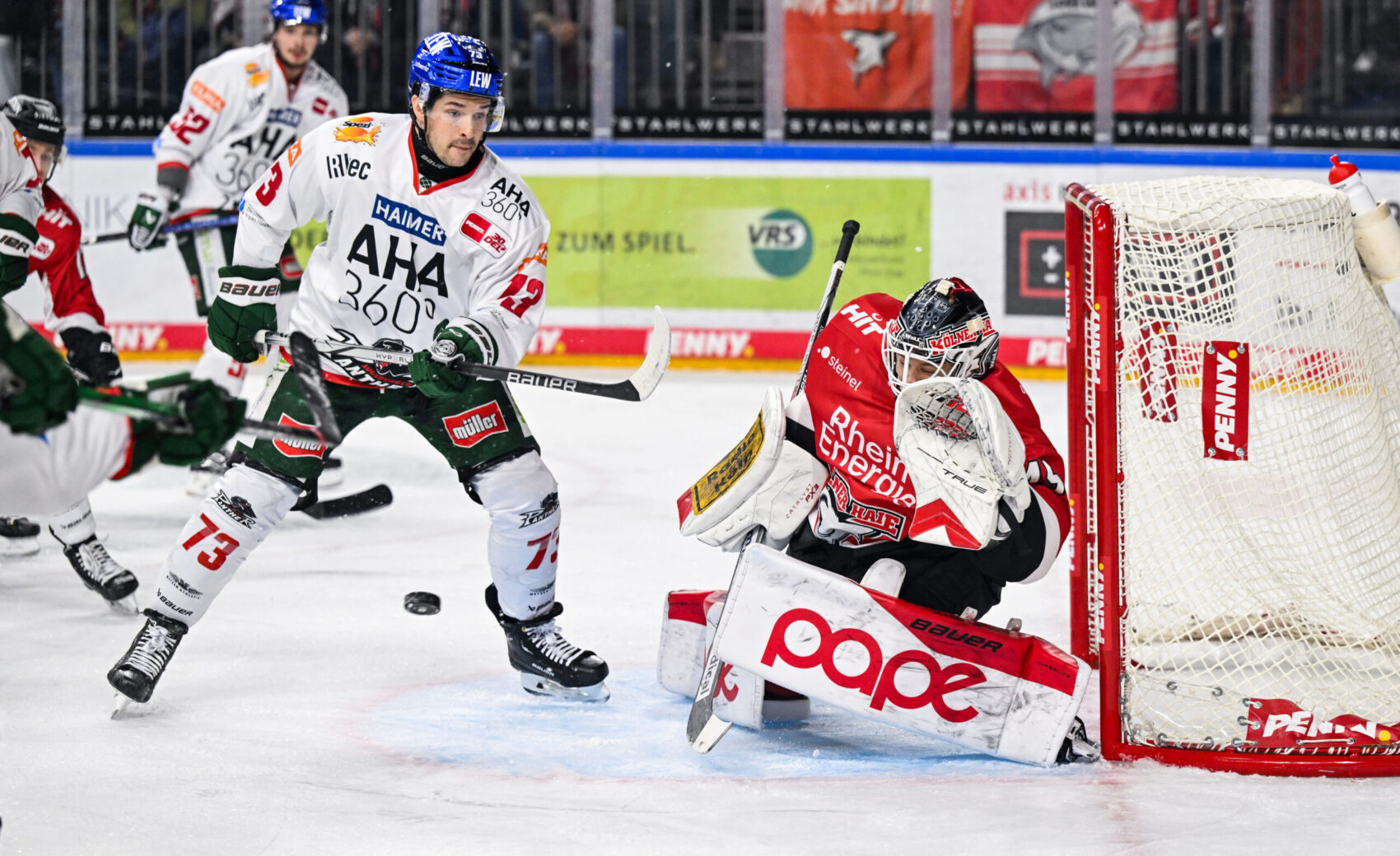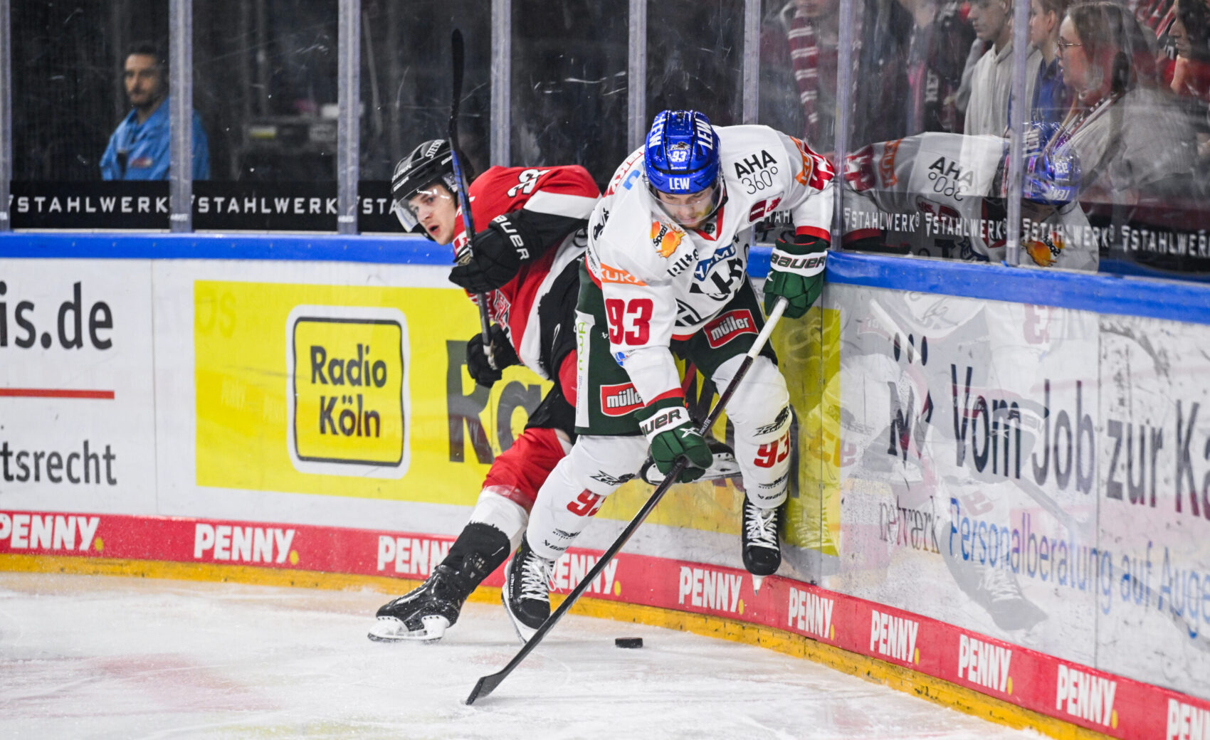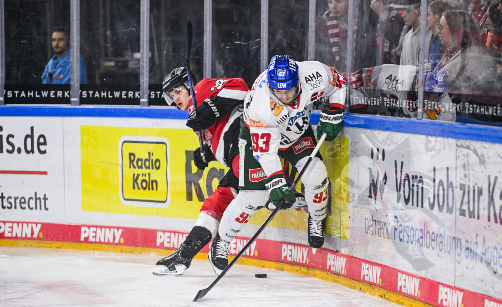 Im ersten Drittel sollten in der LANXESS arena zwischen uns und gut aufgelegten Gästen aus Augsburg vor 14.193 Zuschauern noch keine Tore fallen. Wir kamen besser ins Spiel und hatten nach zwei Minuten die erste groe Möglichkeit zur Führung. Maxi Kammerer passte im 2 auf 1 auf Gregor MacLeod, der es mit einem Direktschuss probierte. AEV-Torhüter Dennis Endras konnte jedoch stark parieren. Zwei Zeigerumdrehungen später hatte Kapitän und Geburtstagskind Moritz Müller die Führung auf der Kelle, doch beide Versuche wusste Endras abzuwehren.