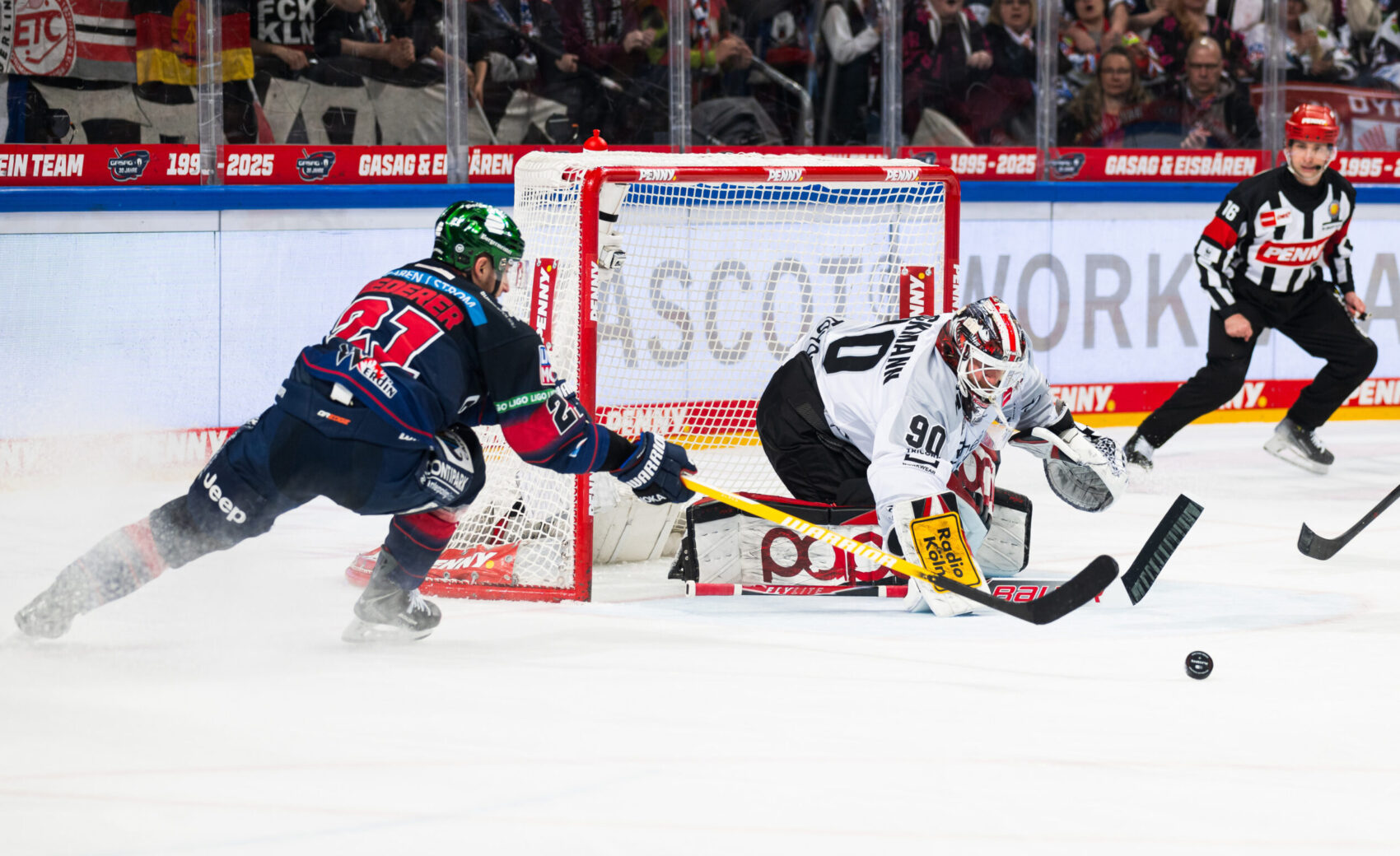 Wir starteten schwungvoll in den Mittelabschnitt, spielten die Eisbären phasenweise im Drittel fest und kamen durch MacLeod und Jan Luca Sennhenn zu guten Abschlüssen. In diese Druckphase hinein setzten die Berliner jedoch einen Doppelschlag: Marcel Noebels verwertete seinen eigenen Rebound aus der Luft zum 1:3 und Jonas Müller erhöhte nur kurz darauf mit einem Schuss aus dem rechten Bullykreis auf 1:4.
