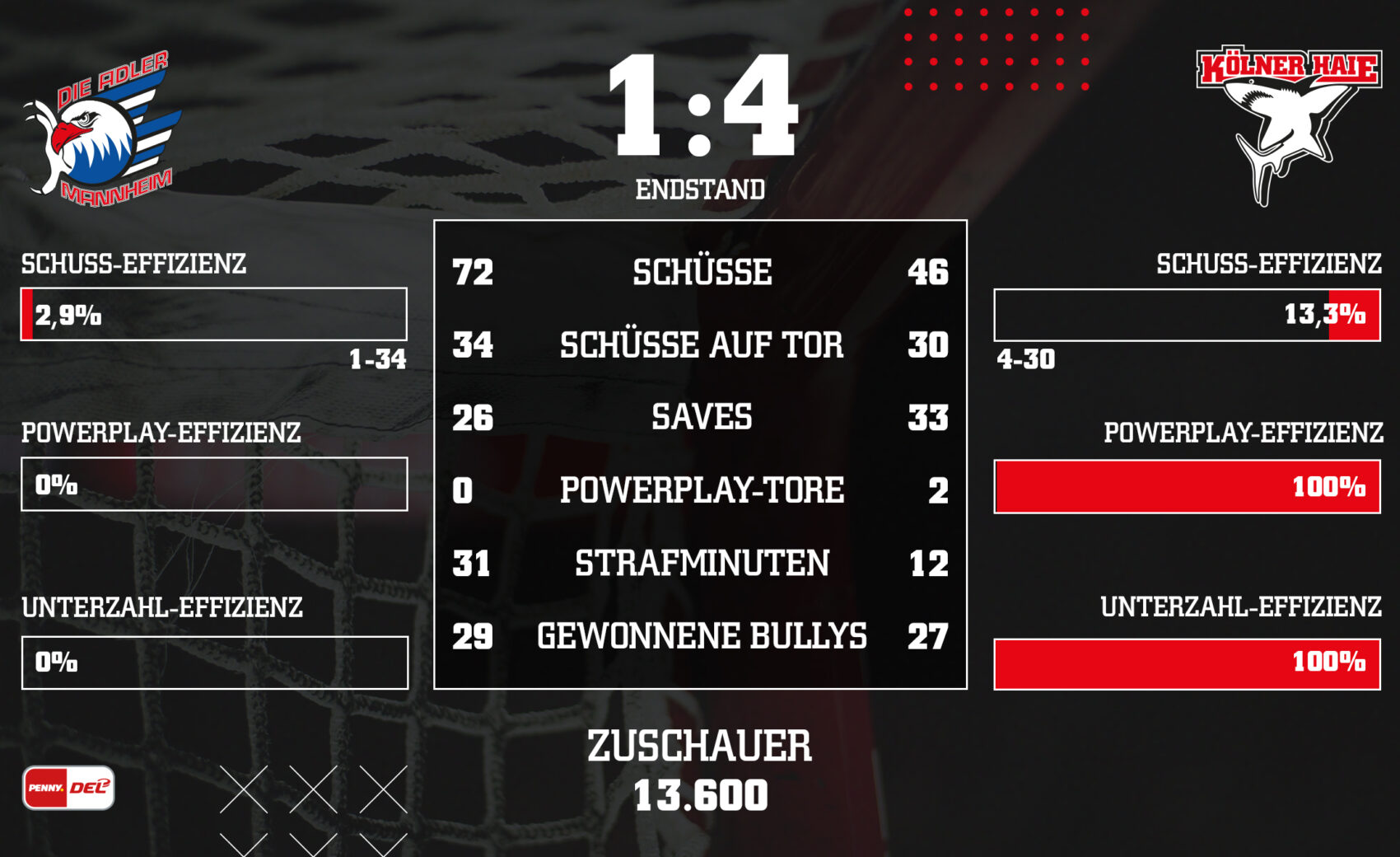 - Starke „Special Teams“: Wir überstanden die Unterzahlsituationen schadlos und konnten gleich zwei Powerplay-Tore erzielen