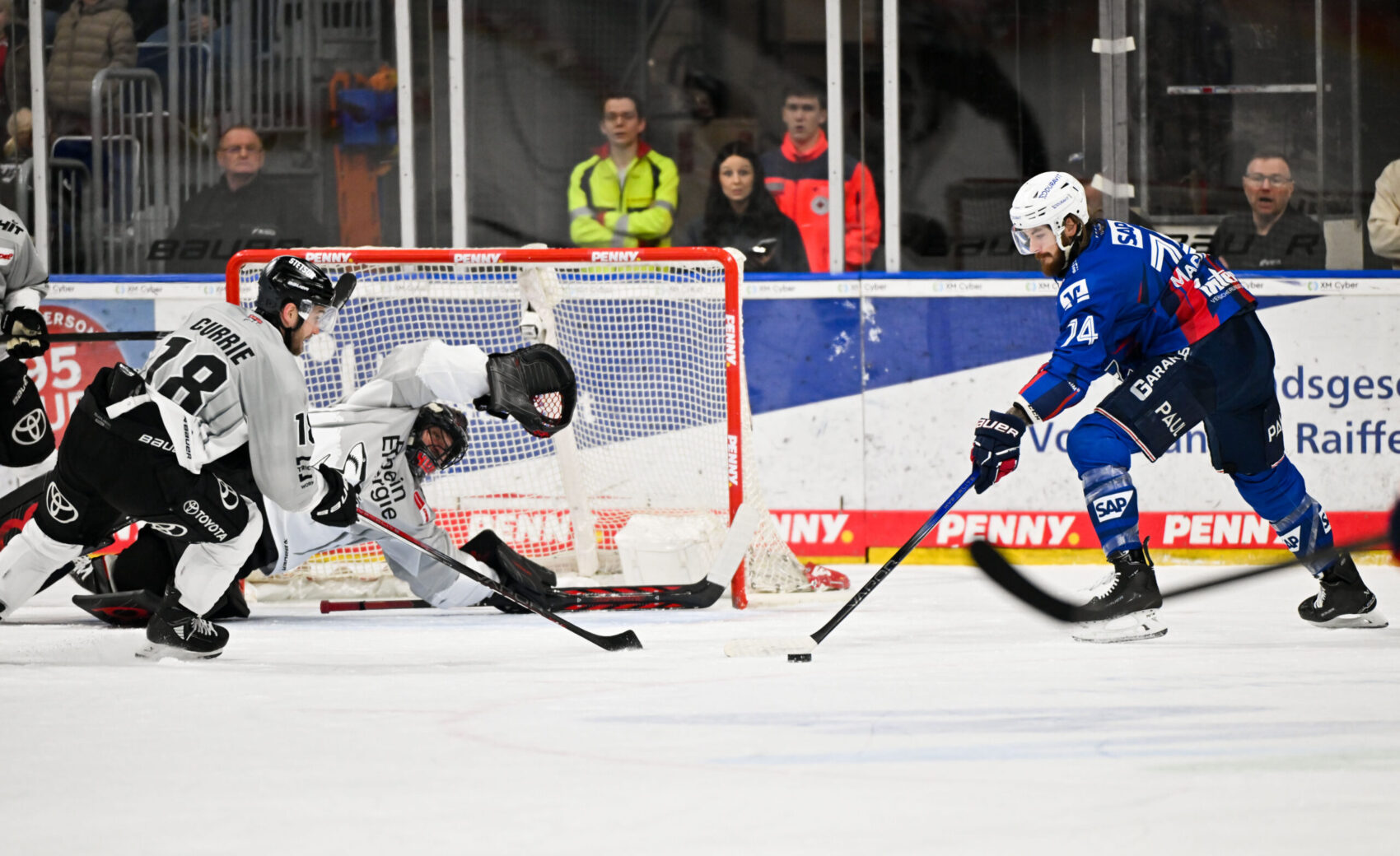 Den Treffer erzielten allerdings wir – und das unmittelbar nach Absitzen der zweiten Strafe. Maximilian Kammerer fuhr noch in Unterzahl einen Konter mit Louis-Marc Aubry. Kammerer gab die Scheibe stark in den Slot, wo Aubry die Kelle an das Spielgerät bekam und und versuchte, entscheidend abzufälschen. Brückmann war jedoch auf der Hut und wollte das Spiel anschlieend schnell machen. Er gab die Scheibe aber an Aubry, der direkt abzog und den Goalie zum Rebound zwang. Kammerer war Nutznieer und erzielte das so wichtige 3:1 (46.)! Josh Currie traf drei Minuten später nur den Pfosten.