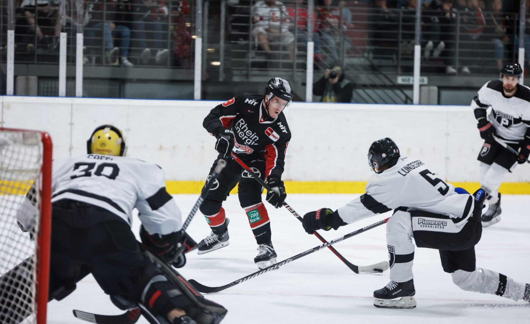 Im ausverkauften Haie-Zentrum entwickelte sich von Anfang an eine intensive Partie, in welcher wir die ersten Tore erzielen konnten – nach zehn Minuten sorgte Alexandre Grenier für die Führung, die Maxi Kammerer nur wenige Sekunden und einen Bullygewinn später auf 2:0 erhöhte. Die Gäste aus Feldkirch spielten jedoch weiter gut mit und hatten zwei große Chancen, die Mirko Pantkowski in unserem Tor aber jeweils stark vereitelte. Die letzte Aktion der ersten 20 Minuten gehörte dann jedoch wieder uns – Kevin Niedenz traf mit seinem Premierentreffer im Profitrikot der Haie zum 3:0 (15.).