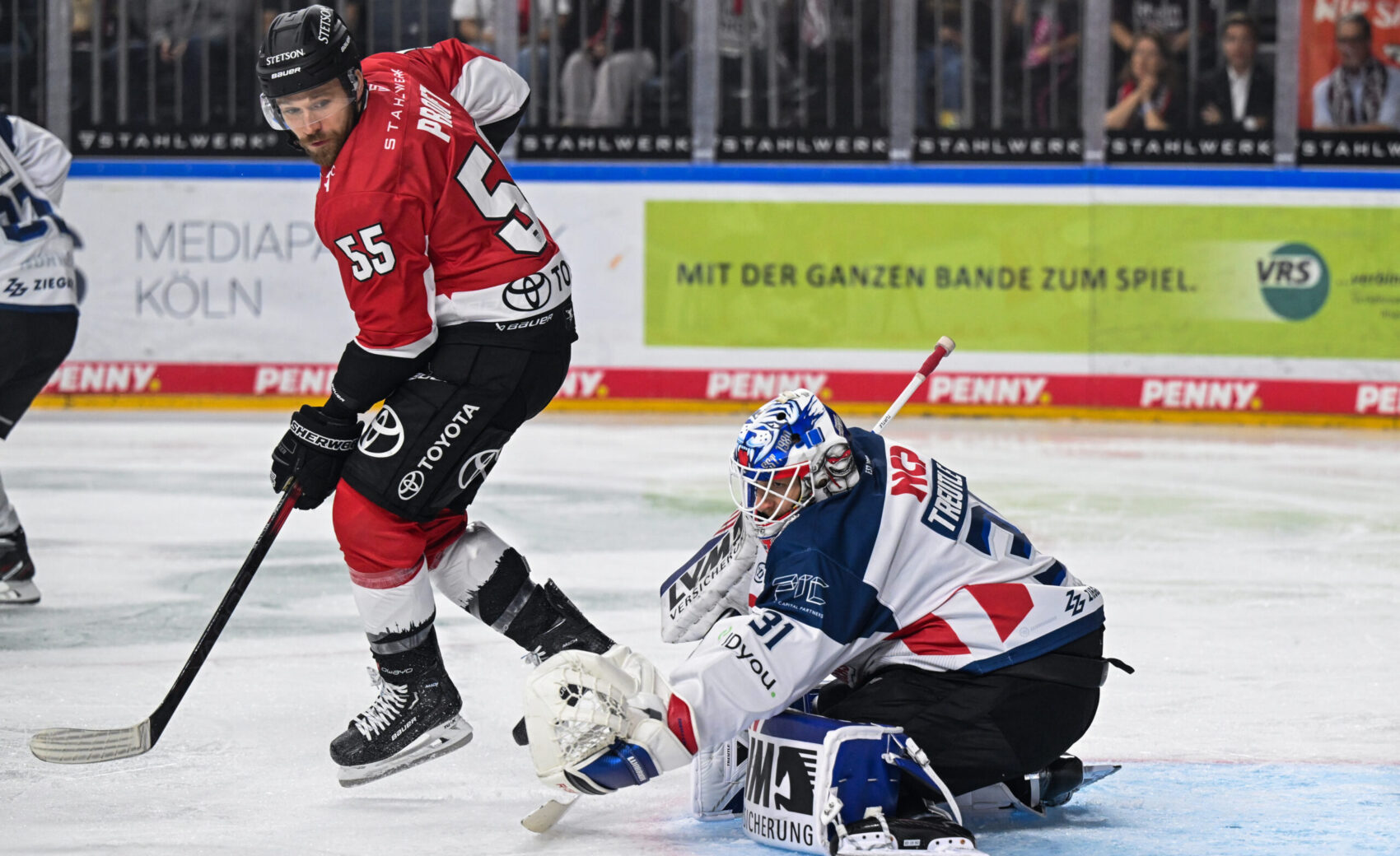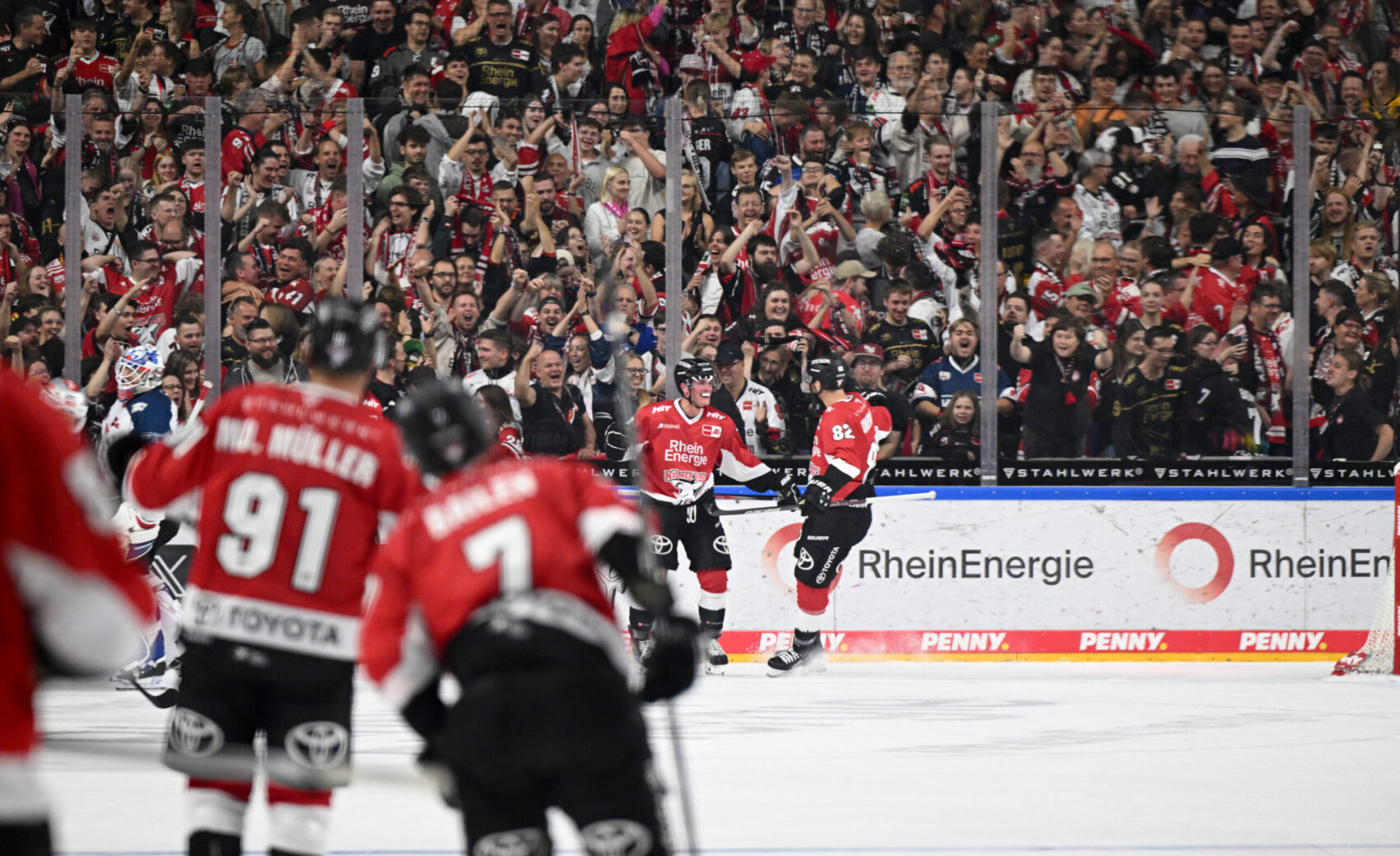 Vor einer traumhaften Kulisse von 18.372 Fans in der LANXESS arena kamen wir gut ins Spiel und konnten die Überlegenheit nach zwölf Minuten in die Führung ummünzen. Justin Schütz wurde von Alexandre Grenier nach einem Scheibengewinn im eigenen Drittel mit einem starken Pass auf die Reise geschickt und lie Nürnbergs Torwart Niklas Treutle mit einem Schuss durch die Beine keine Chance, 1:0! Sieben Sekunden später brachte Gregor MacLeod mit seinem Tor zum 2:0 die LANXESS arena kurzfristig zum Beben – von der blauen Linie nahm unsere Nummer 89 Fahrt auf, zog ab und traf zum zweiten Tor des Tages. Mit dem Stand von 2:0 ging es in die erste Drittelpause.