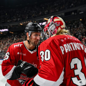 Das zweite Drittel sollte dann komplett in unserer Hand liegen – nachdem Brady Austin in der 22. Minute mit einem One-Timer noch an Treutle scheiterte, hatte Louis Marc Aubry drei Minuten später etwas mehr Glück. Nach einem Gestochere behielt unsere Nummer 15 den Überblick und spitzelte die Scheibe unter Treutle hindurch zum 3:0 (25.). Dann folgte eine ganz starke Phase, die mit zwei schönen Toren belohnt wurde. Nick Bailen legte links raus auf Müller, der die Scheibe in den Slot brachte, wo Grenier die Kelle hinhielt und überlegt zum 4:0 traf. Doch damit nicht genug. Nicht mal eine Minute später war es fast die gleiche Kombination, die für unseren nächsten Treffer sorgte. Grenier, der heigelaufen war, und Müller spielten Doppelpass, an dessen Ende Grenier zunächst an Treutle scheiterte, doch den Rebound sehenswert aus der Luft zum 5:0 versenkte.