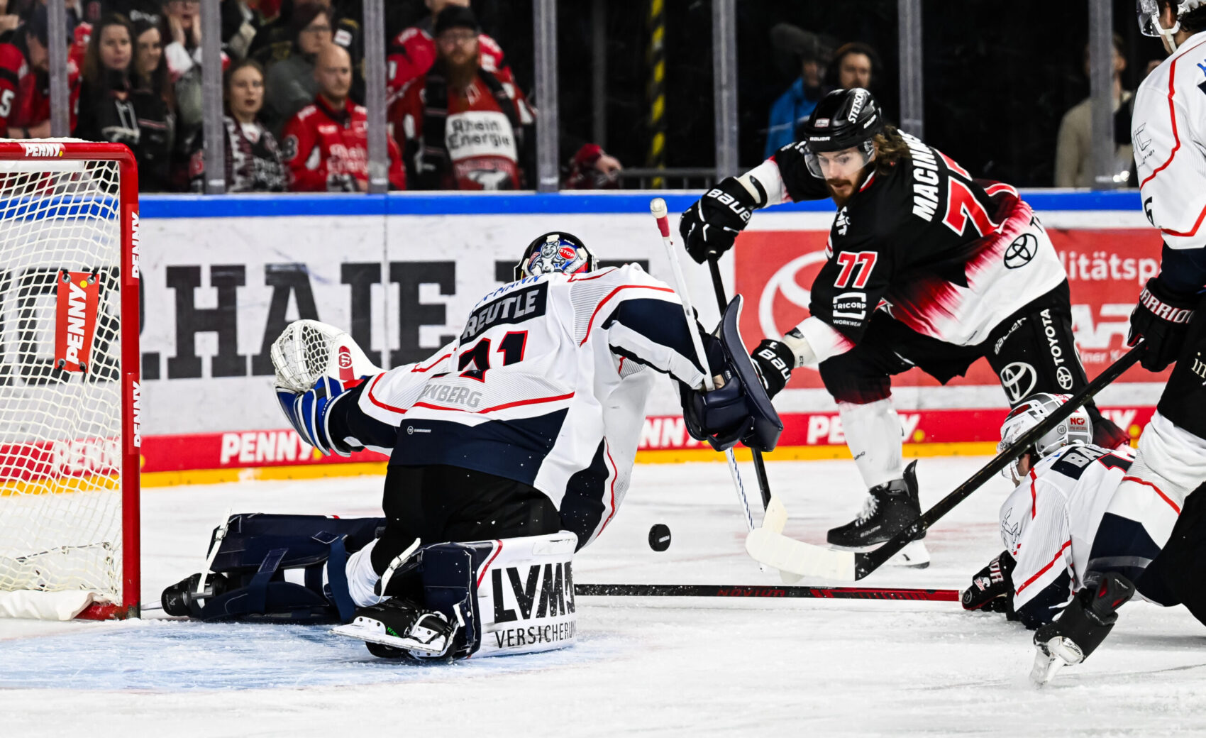 Es entwickelte sich von Anfang an eine Partie auf Augenhöhe, sodass es nicht verwunderte, dass den Gästen die erste Chance des Duells gehörte. Evan Barratt bekam im Slot einen Rebound, handelte schnell und setzte die Scheibe anschlieend nur Zentimeter am Kasten vorbei. Wir konnten durch Ryan MacInnis in der vierten Minute die erste Chance verzeichnen, bissen uns an der Nürnberger Defensive aber immer wieder die Zähne aus.