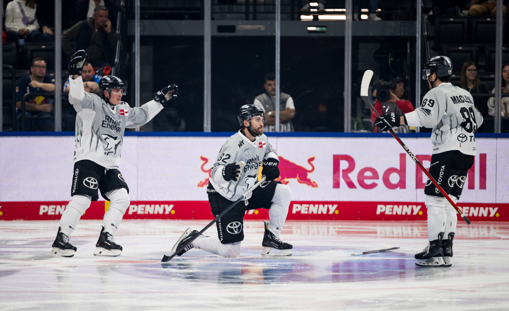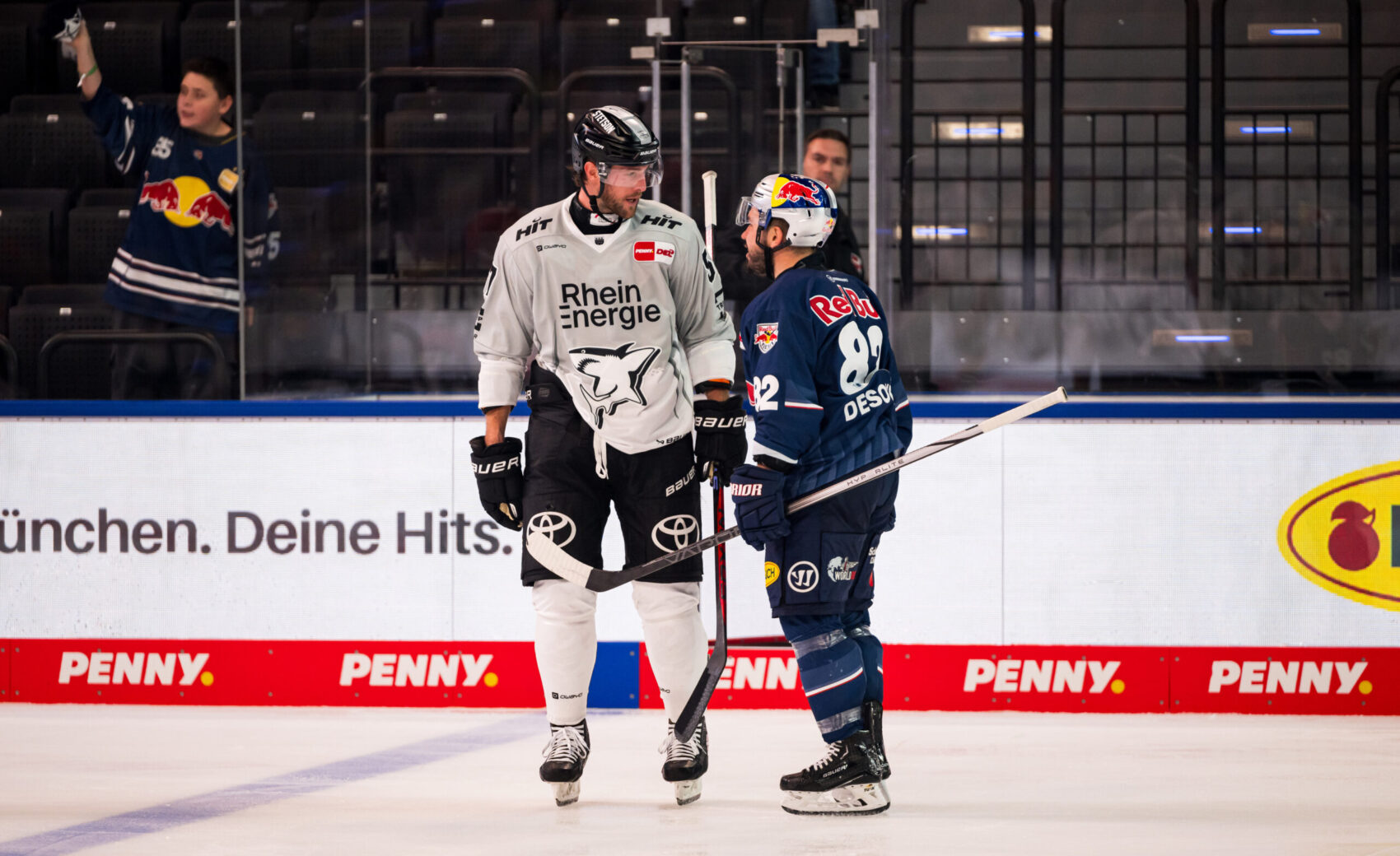 Die letzten 20 Minuten sollten es dann aber in sich haben – und wie! Doch der Reihe nach. Zunächst eröffnete Grenier das dritte Drittel mit einem Powerplay-Tor nach Vorlagen von seinen Reihenpartnern MacLeod und Schütz (42.). Nur fünf Minuten später kamen die Gastgeber – auch bedingt durch eine Strafe gegen uns – zum Anschlusstreffer durch DeSousa, der ihm das vielzitierte „Momentum“ gab – nur noch 3:2. Eine Minute später, wieder saen wir auf der Strafbank, gelang dem deutschen Nationalspieler Markus Eisenschmid der Ausgleich für RBM, 3:3 (48.).