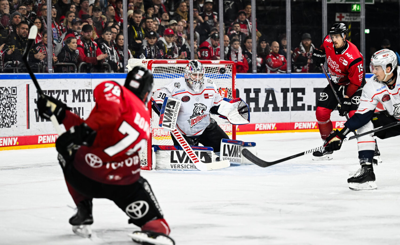 Und auch in Folge war das Spielgeschehen im ersten Drittel oftmals ein Spiel auf ein Tor. Unsere Mannschaft präsentierte sich sehr spielfreudig und kombinierte sich immer wieder in die Offensive. Dabei sollten ihnen auch die Specialteams zu Gute kommen. In Überzahl nutzte Patrick Russell vor dem Tor seinen Freiraum und traf vorbei an Ice Tigers-Goalie Fitzpatrick zum 2:0. Kurz vor Drittelende legte Dominik Bokk – ebenfalls in Überzahl – mit dem wohl schönsten Treffer des Abends nach. MacLeod legte die Scheibe einmal quer durch das Offensivdrittel auf die Kelle Bokks, der direkt abzog und das Hartgummi unhaltbar für Fitzpatrick in die Maschen setzte. Ein herrlicher Schlusspunkt eines starken Haie-Drittels.