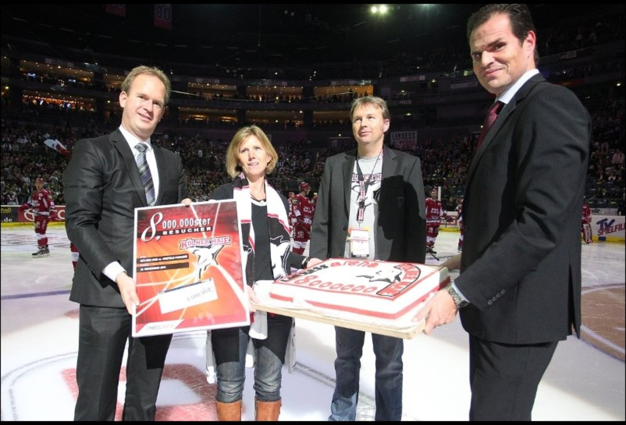 Alexandra Zimmermann staunte nicht schlecht. Als achtmillionster Fan eines Kölner Eishockey-Heimspiels in Bundesliga- bzw. DEL wurde sie am Freitag in der LANXESS arena besonders herzlich empfangen. Sie erhielt von Stefan Löcher (links im Bild) und Oliver Merches (rechts) von der LANXESS arena sowie Haie-Geschäftsführer Jan Broer (Mitte) neben einer Urkunde eine riesige Glückwunsch-Torte.