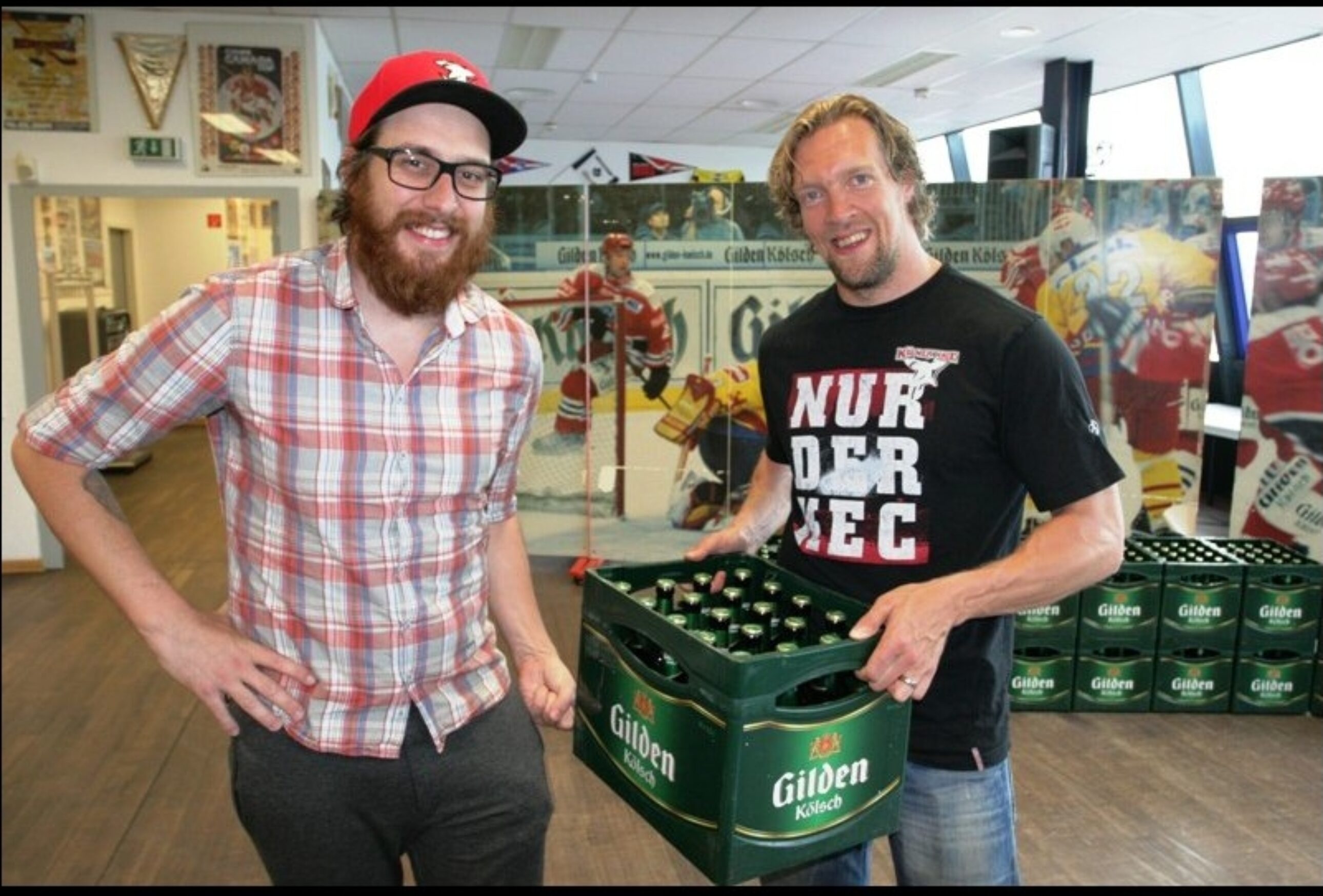 „Das passt doch perfekt zur WM“, freute sich Haie-Fan Michael, als er freudestrahlend seinen persönlichen Gilden-Kasten aus den Händen Daniel Tjärnqvists in Empfang nahm. Rechtzeitig zum Start ins Wochenende verteilte der KEC-Verteidiger am Freitag die 97 Kästen Frei-Kölsch, die Haie-Partner Gilden für die KEC-Fans spendiert hatte.