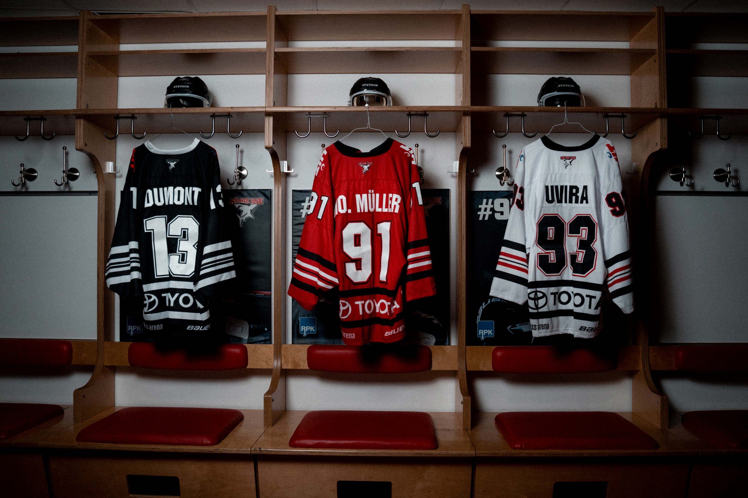 Die neuen Haie-Trikots sind da! Zuhause spielt der KEC wieder in roten Farben. Auswärts treten die Haie in weien Trikots an. Das Third-Jersey ist schwarz-wei.