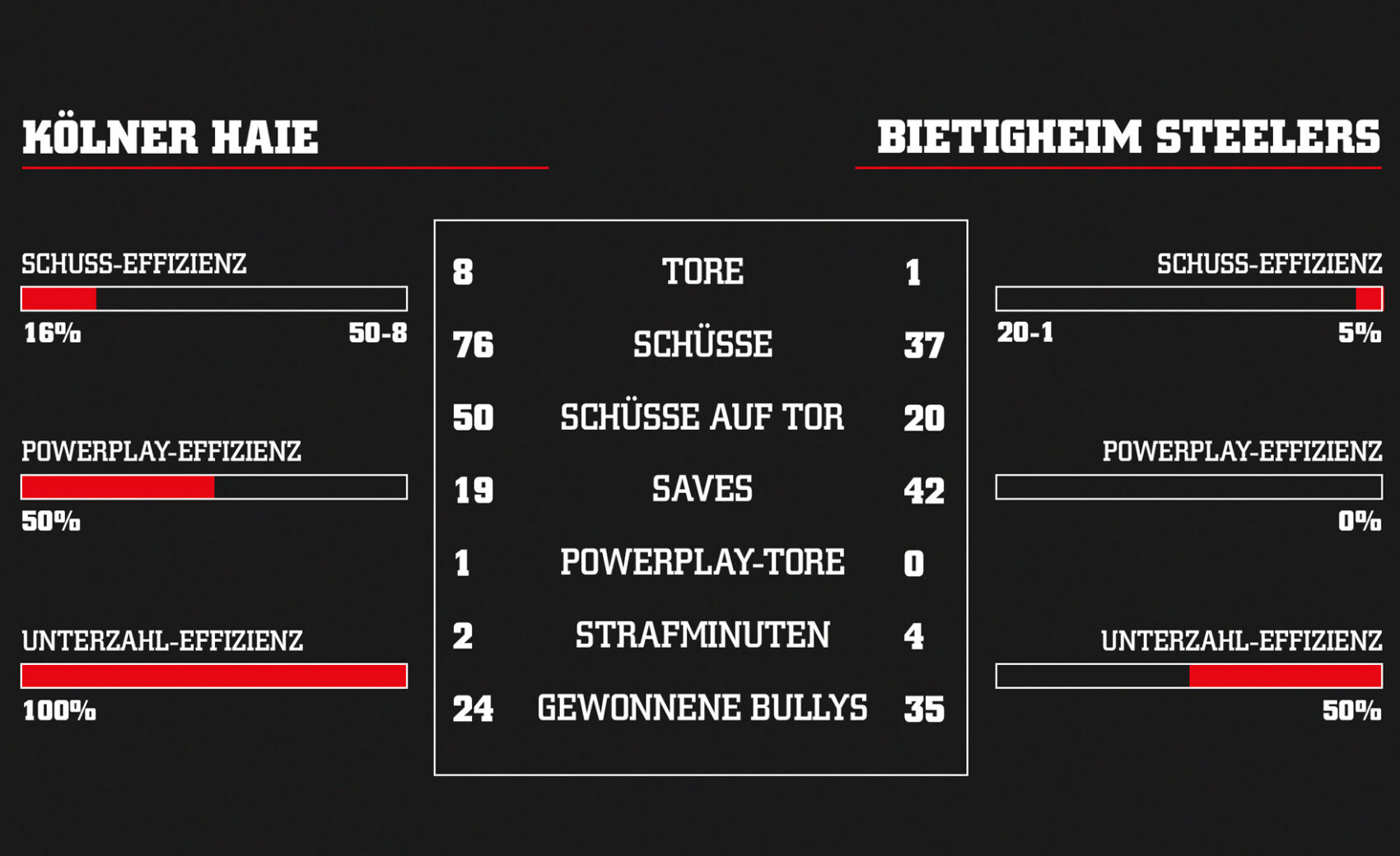 Die Kölner Haie zeigen eine starke Reaktion auf zuletzt zwei Niederlagen in Folge und schlagen die Bietigheim Steelers in der heimischen LANXESS arena mit 8:1. Beim Erfolg über den Tabellenletzten der PENNY DEL können gleich sieben (!) unterschiedliche KEC-Spieler ein Tor erzielen. Mark Olver trifft zudem doppelt.