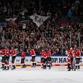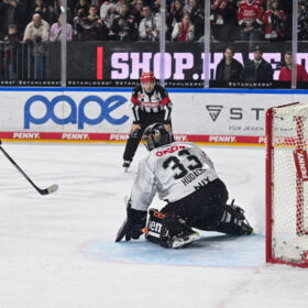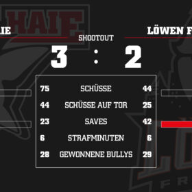 Was für ein Comeback! Unsere Mannschaft zeigt beim Heimspiel gegen die Löwen Frankfurt eine vor allen Dingen mental starke Leistung und dreht einen 0:2-Rückstand in einen 3:2-Erfolg nach Penaltyschieen. Nachdem Louis-Marc Aubry uns im zweiten Drittel wieder heran bringt, ist es Justin Schütz, der mit zwei Treffen den verdienten Heimsieg perfekt macht.