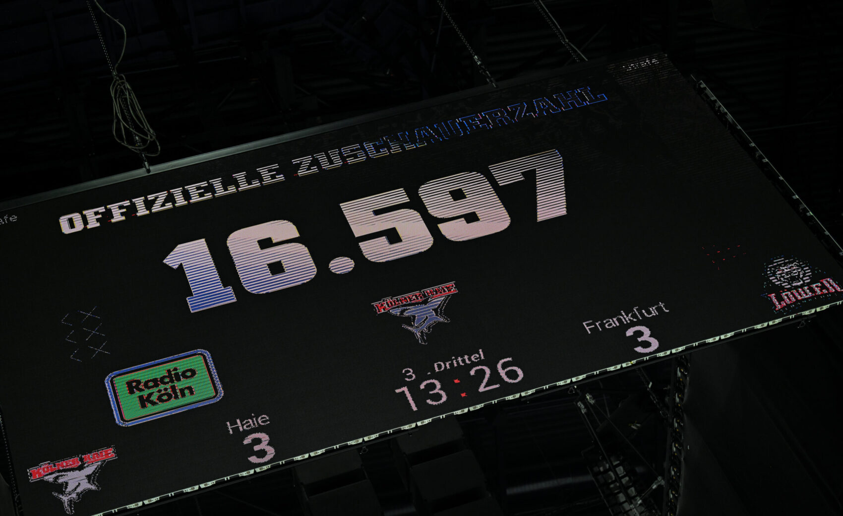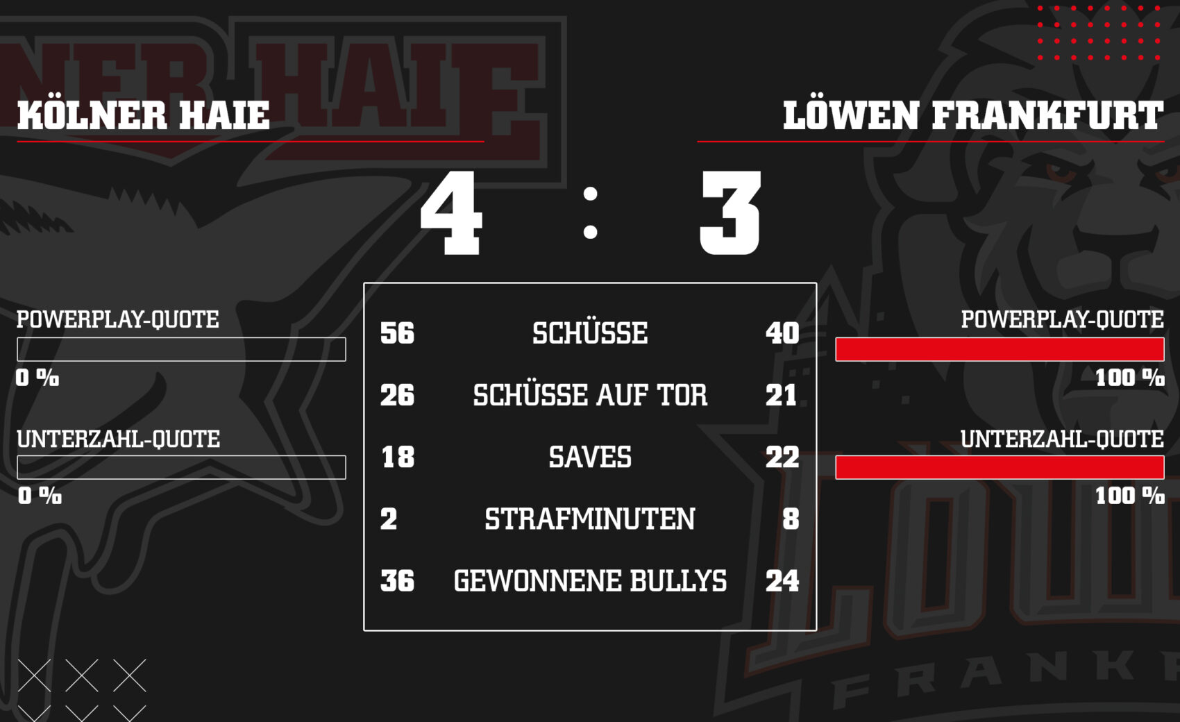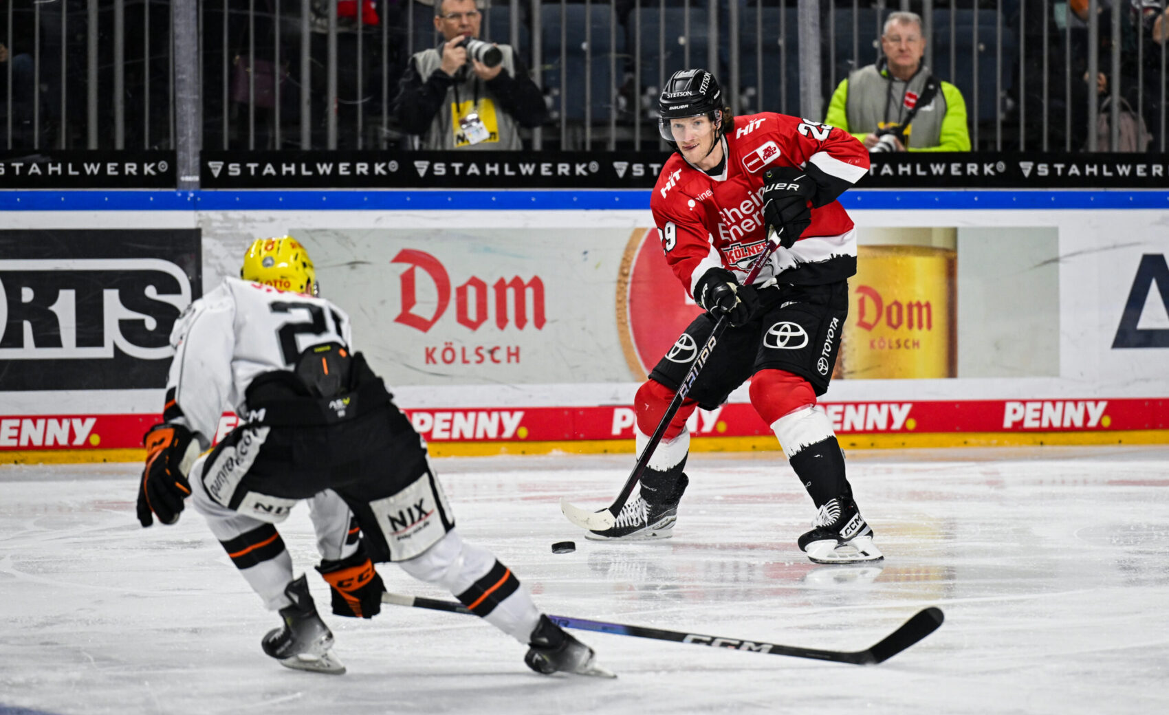 Vor 16.597 Zuschauer in der wieder einmal gut besuchten LANXESS arena brauchten beide Mannschaften etwas, um in der Partie anzukommen. Folgerichtig sollte es auch torlos in die erste Pause gehen. Dies hätte sich, besonders in der siebten Minuten ändern können, doch Andreas Thuresson traf nur den rechten Torpfosten. Auch seine Reihenkollegen Maxi Kammerer und Louis-Marc Aubry verpassten den ersten Torjubel des Tages, als sie in der zehnten Minute nach einem Frankfurter Aufbaufehler an dessen Torhüter Joe Cannata scheiterten. Auf der Gegenseite fanden die Löwen, insbesondere dessen Top-Scorer Cody Kunyk seinen Meister in Tobias Ancicka, der für uns wieder zwischen den Pfosten stand.