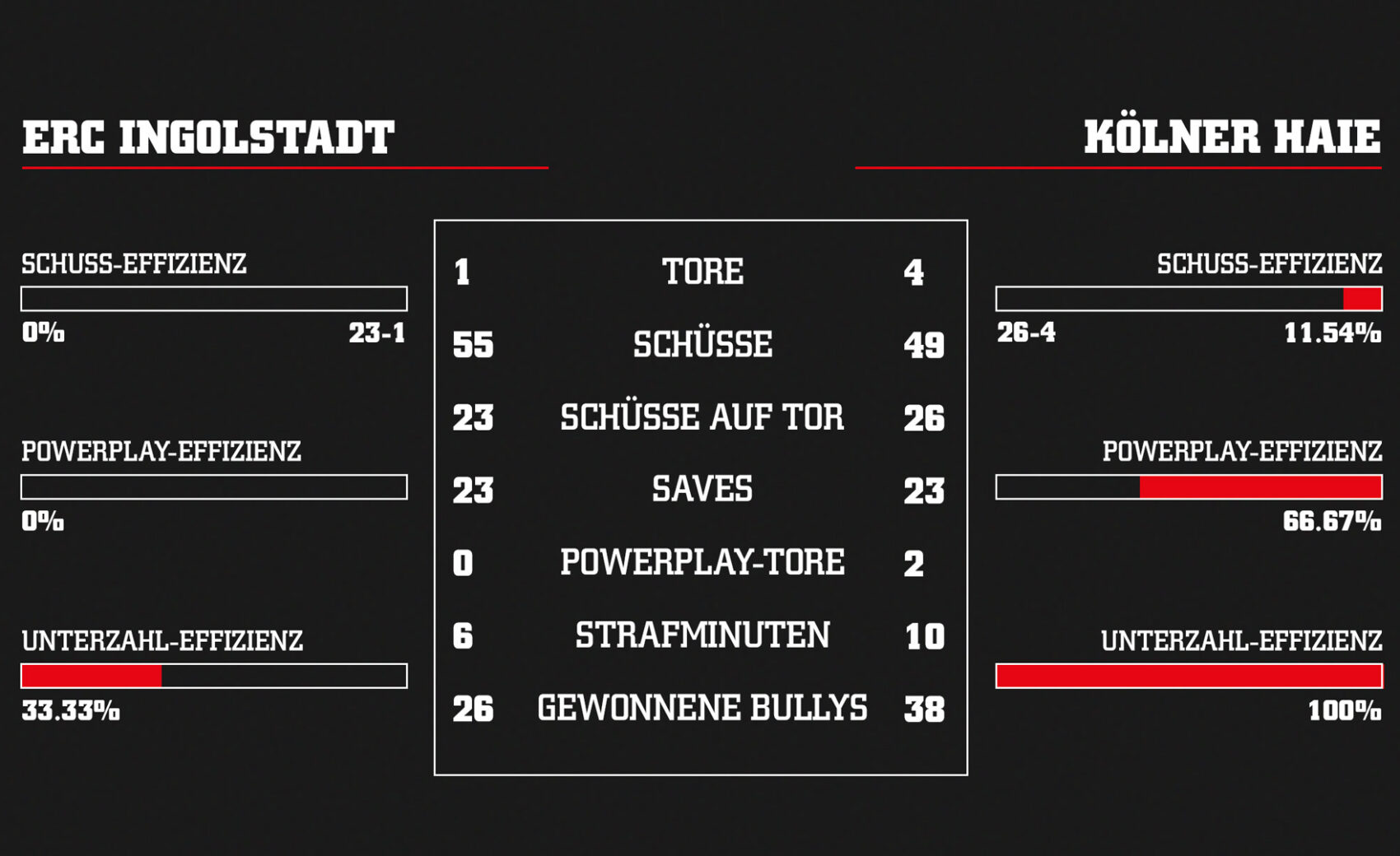 Diesen Vorsprung konnten die Kölner dann auch im dritten Drittel halten. Auch, da besonders das Unterzahlspiel an diesem Abend hervorragend funktionierte. Im Powerplay sorgte Andreas Thuresson gut vier Minuten vor dem Ende für das wichtige dritte Haie-Tor. Gut drei Minuten später markierte der schwedische Angreifer mit seinem Treffer ins verwaiste Ingolstädter Gehäuse den 4:1-Endstand.