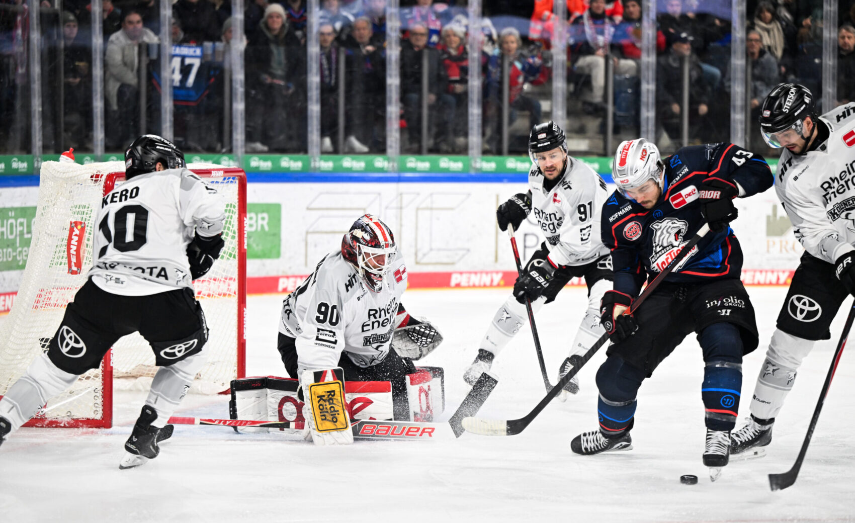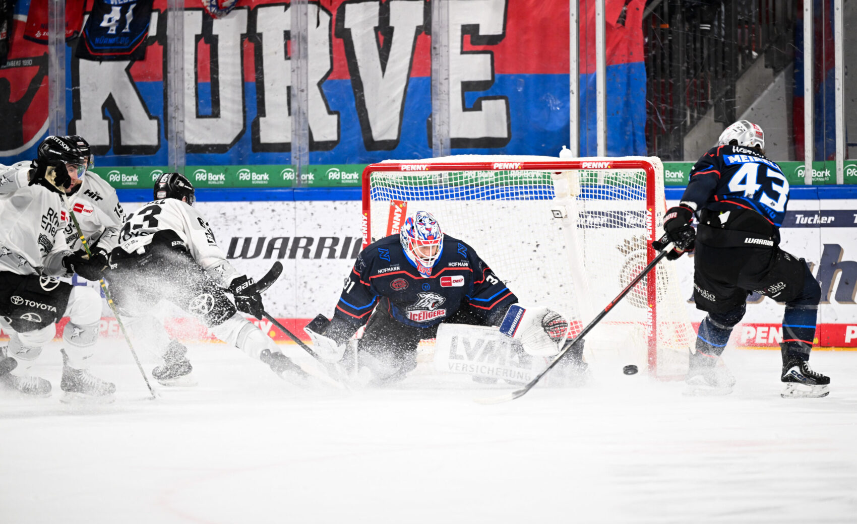 Das erste Drittel zeigte, warum die Nürnberger zuhause zu den offensiv stärksten Teams der PENNY DEL gehören. Unser Team um Cheftrainer Kari Jalonen, der beim Auswärtsspiel in Nürnberg, seinen 66. Geburtstag feierte, wurde von den aggressiven und schnell skatenden Ice Tigers von Anfang an gut gefordert – nach 13 Minuten hatten die Hausherren die erste richtig gute Gelegenheit, die wir aber überstanden. Meireles setzte den Puck nach einem Scheibenverlst von uns in der Offensivzone per One Timer nur an das Außennetz.