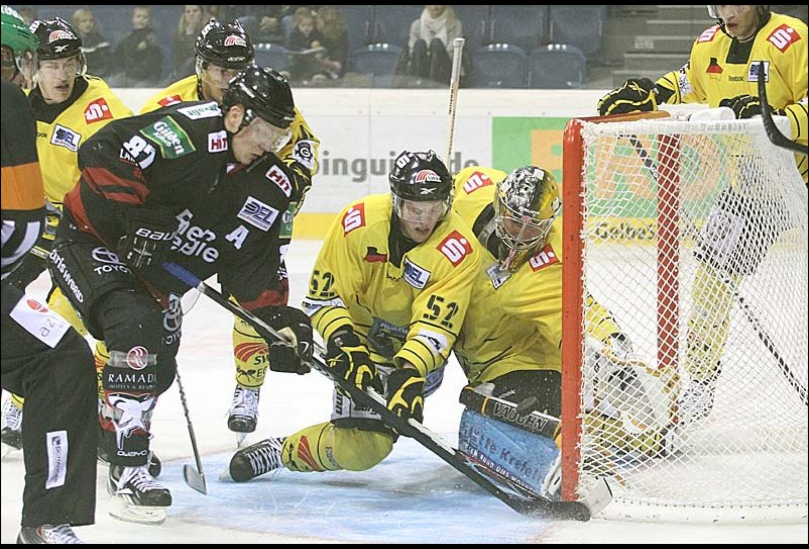 Abwechslungsreich und insgesamt sehr ausgeglichen begann das rheinische Duell zwischen KEV und KEC. Die Haie hatten durch Philip Gogulla und Christoph Ullmann die ersten Chancen, sie scheiterten aber an Krefelds Torwart Scott Langkow (1. und 2.). Die Pinguine-Fans hatten den Torschrei auf den Lippen, als Pascal Trepanier die Latte des Kölner Tors traf (3.). Kurz darauf hatte KEC-Stürmer Ivan Ciernik die Führung auf der Kelle. Sein Schuss flutschte Langkow durch die Schoner, aber auch am Tor vorbei. Im Powerplay klappte es dann – auf beiden Seiten. Zunächst staubte Gogulla in Überzahl ab (10.), nach einer Direktkombination schaffte Herbert Vasiljevs das 1:1 für die Gastgeber (13.).