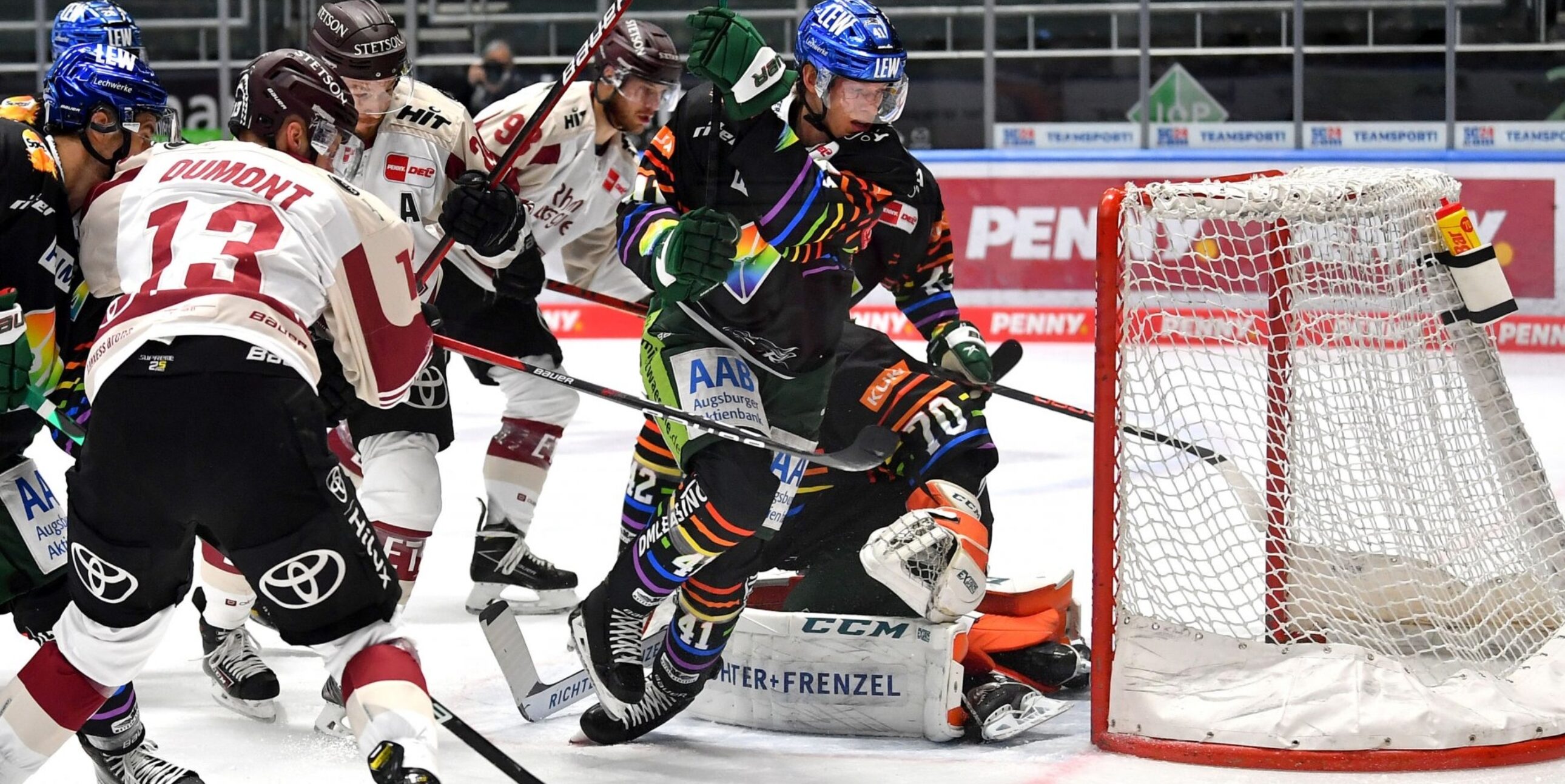 Im Bild: Haie-Stürmer Lucas Dumont (vorne) und andere Spieler vor dem Augsburger Tor (City-Press GmbH)