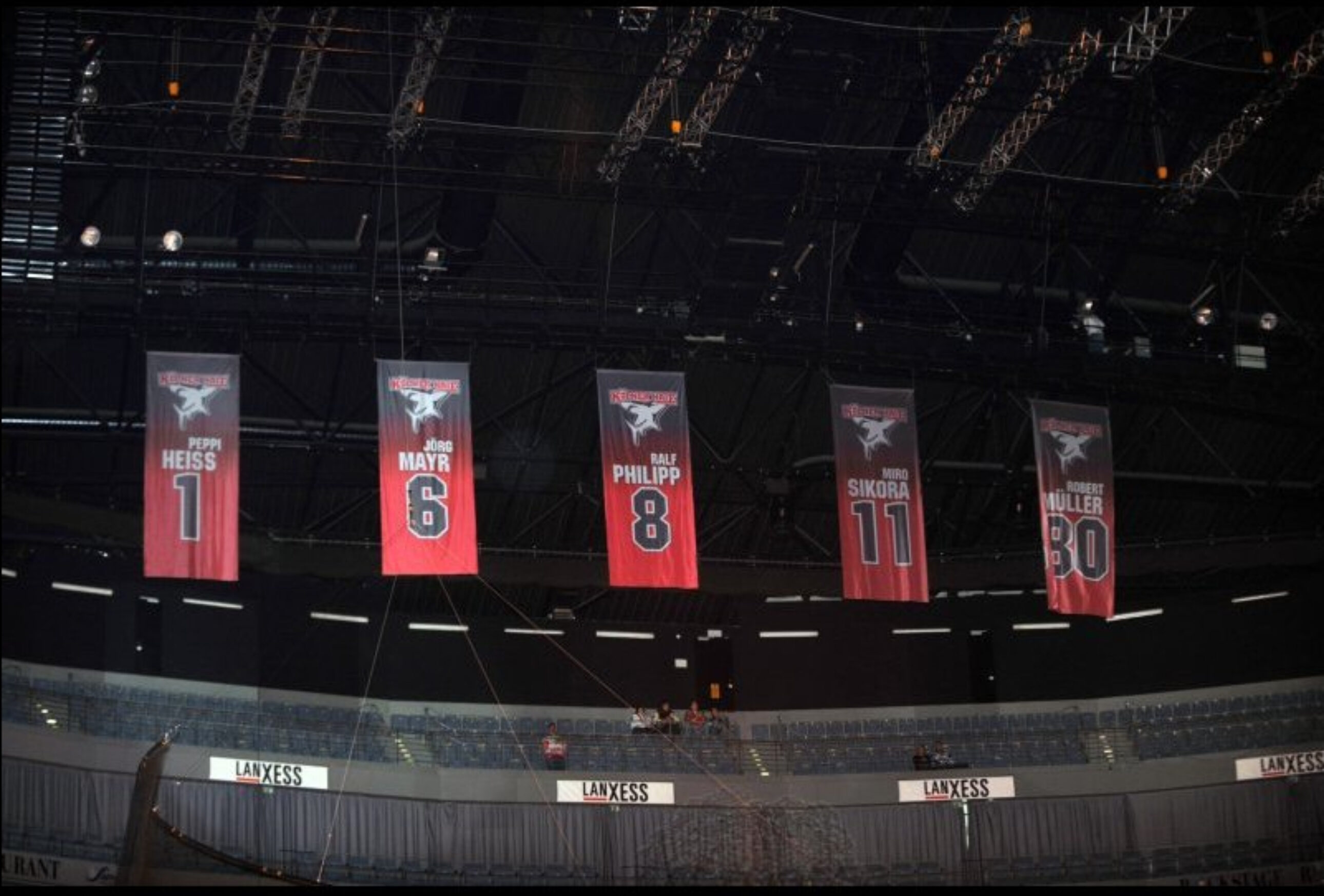 Dunkle Halle, Scheinwerferlicht und viele Erinnerungen. Als die Bilder des Peppi Heiss-Abschiedsspiels von 2001 über den Videowürfel flackerten, hatte manch ein Haie-Fan Tränen in den Augen. Die festliche Präsentation der Ehrenbanner mit den Trikotnummern 1, 6, 8, 11 und 80, die beim KEC aus Respekt und Anerkennung für die Spieler, die sie zuletzt trugen, nicht mehr vergeben werden, war bewegend. Peppi Heiss sendete per Videobotschaft Grüe in die Arena, bei Mayr, Philipp, Sikora und Müller erinnerten viele Fotos aus vergangenen Tagen an ihre Karriere und ihr Wirken. „Fünf besondere Menschen und fünf besondere Spieler“, traf Stadionsprecher Oliver Frühauf genau den Punkt. Groen Applaus und „Robert Müller“-Sprechchöre gab es, als die Nummer 80 unter das Arena-Dach gehängt wurde.
