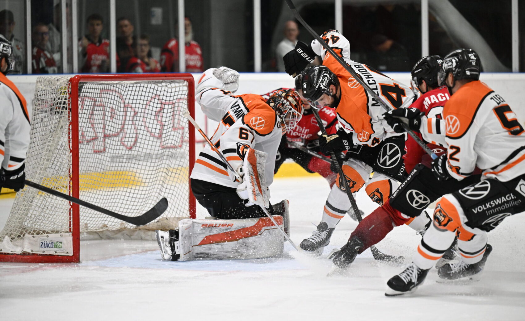 Diesen konnten wir im dritten Drittel dann allerdings eindrucksvoll drehen – nachdem Tuomie (46.) und Kammerer (48.) noch knapp verpasst hatten, belohnte Russell einen starken Schlussabschnitt mit dem Anschlusstreffer. Der Däne kam im Powerplay in ähnlicher Position wie bereits MacInnis beim 1:0 zum Abschluss und traf zum 2:3 (52.). Kurz darauf erhielt Dumont auf Wolfsburger Seite nach Check gegen Tuomie eine Fünf-Minuten-Strafe (plus Spieldauer), die wir nutzten.