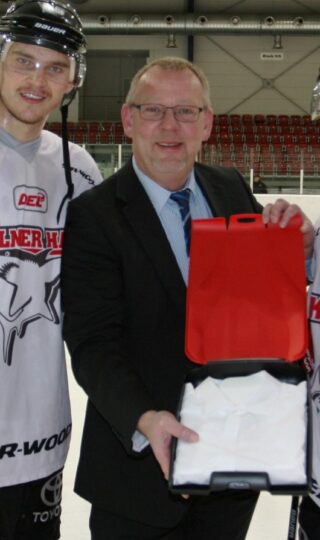 Die leichte, aber harte Plastikbox garantiert einen komfortablen Transport von Hemden. Miko-Hordijk lieferten die Shirtcases bei der offiziellen Übergabe durch Business Unit Manager Josef Vukmanic natürlich in den Haie-Farben aus.