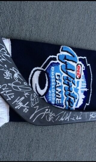 Für seine Tripp-Charity hat John Tripp heute wieder einen ganz besonderen Preis dabei: Dieses Mal gibt es einen im Winter Game gespielten Original-Schläger samt Schal vom Haie-Kapitän zu gewinnen. Der Schläger ist von allen Spielern der Haie und der DEG unterschrieben. Lose (2,- Euro) gibt es u.a. am Info-Counter-Nord.