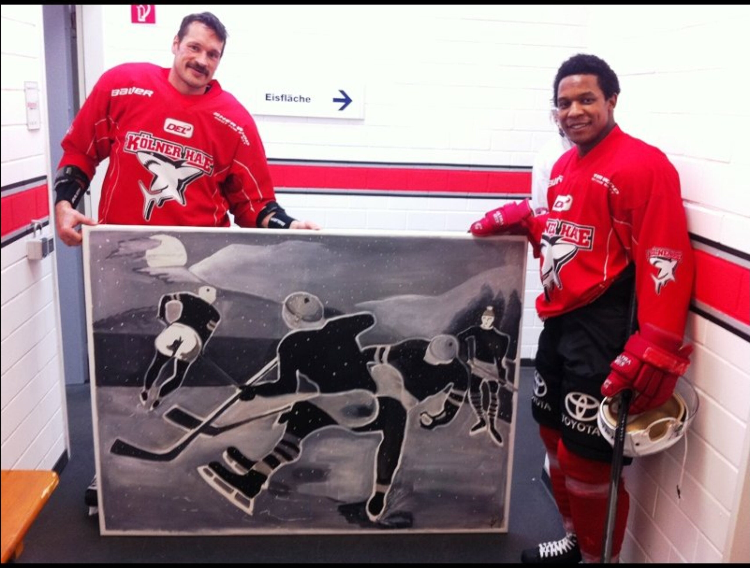 Einen Monat lang hat Nathan Robinson den Pinsel geschwungen – jetzt ist das Werk vollendet. Der Haie-Stürmer mit der künstlerischen Ader hat ein Gemälde erstellt, welches er jetzt der Haie-Charity zur Verfügung stellt. Fans, die am 26.12. beim Heimspiel gegen Mannheim Lose kaufen (ab € 2,- u.a. am Info-Counter-Nord) können diesen original „Robinson“ gewinnen. Das Gemälde zeigt eine Eishockey-Szene aus dem 19. Jahrhundert.