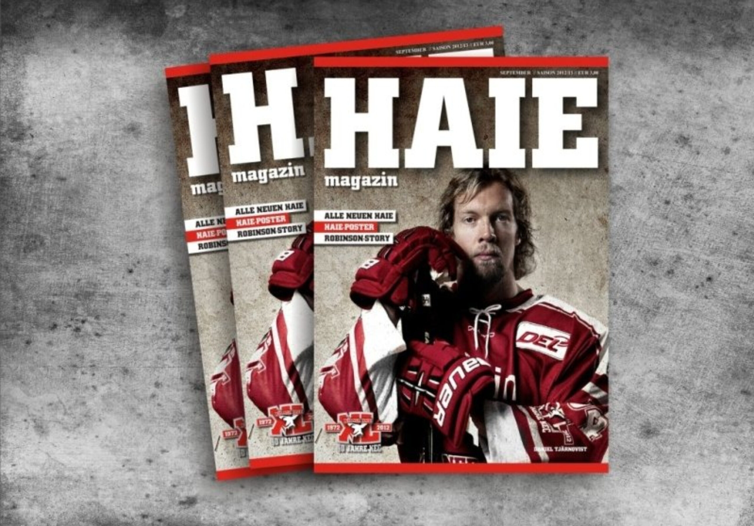 Pünktlich zum Saisonstart am Freitag geht das erste Haie-Magazin 12/13 in den Verkauf. Diesmal im Heft: Vorstellung der Neuzugänge, eine Story über Nathan Robinson, unsere Heimgegner im Portrait, das neue Teamposter der Haie, viel Raum für Fanclubs, eine Zeitreise zum Beginn der Haie-Ära sowie viele Bilder, News und Infos.