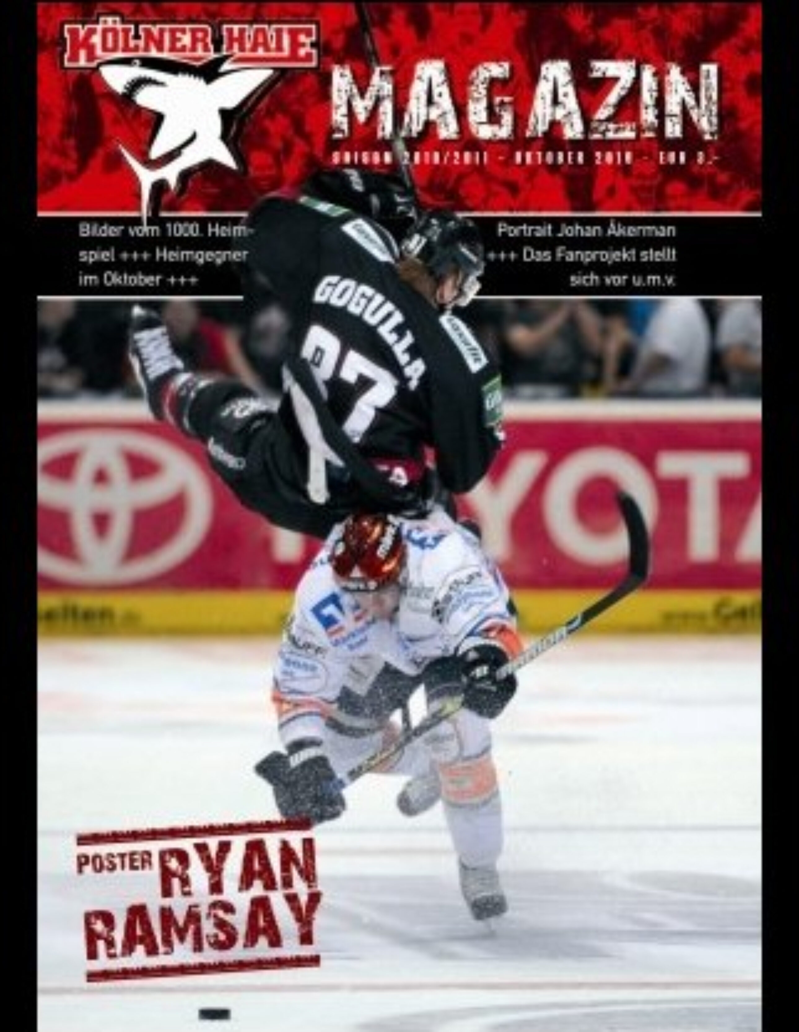 Diesmal im Magazin: Ein Poster von Ryan Ramsay, Hintergrundberichte über unsere Oktober-Heimgegner Berlin, Nürnberg, Hamburg und Hannover, Impressionen vom 1000. Heimspiel, eine kleine Eishockey-Regelkunde, ein Portrait über Johan Akerman, das beliebte Silbenrätsel, ein Bericht über die Frau im Haie-Team, eine spannende Zeitreise, Infos zum Fanprojekt, ein Report aus Florida, News, Wichtiges vom Nachwuchs u.v.m.