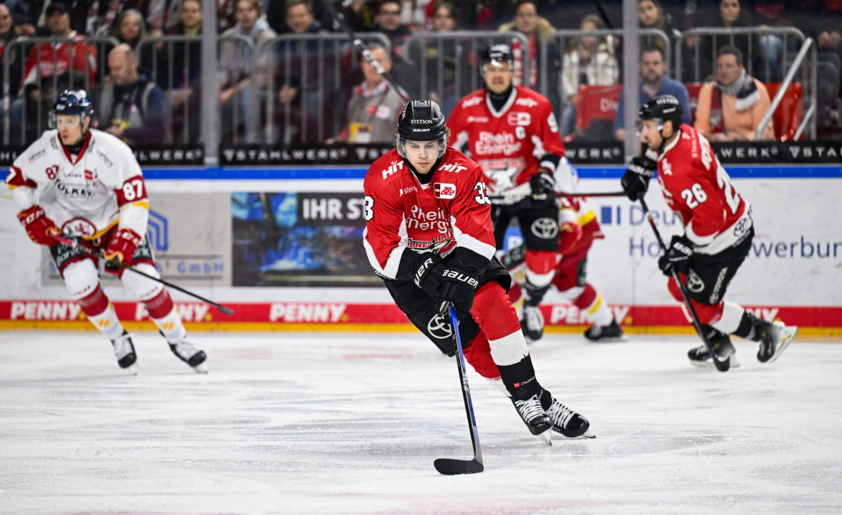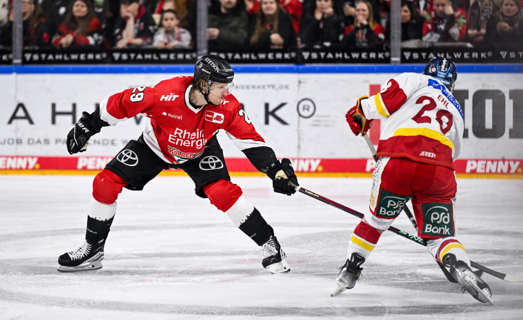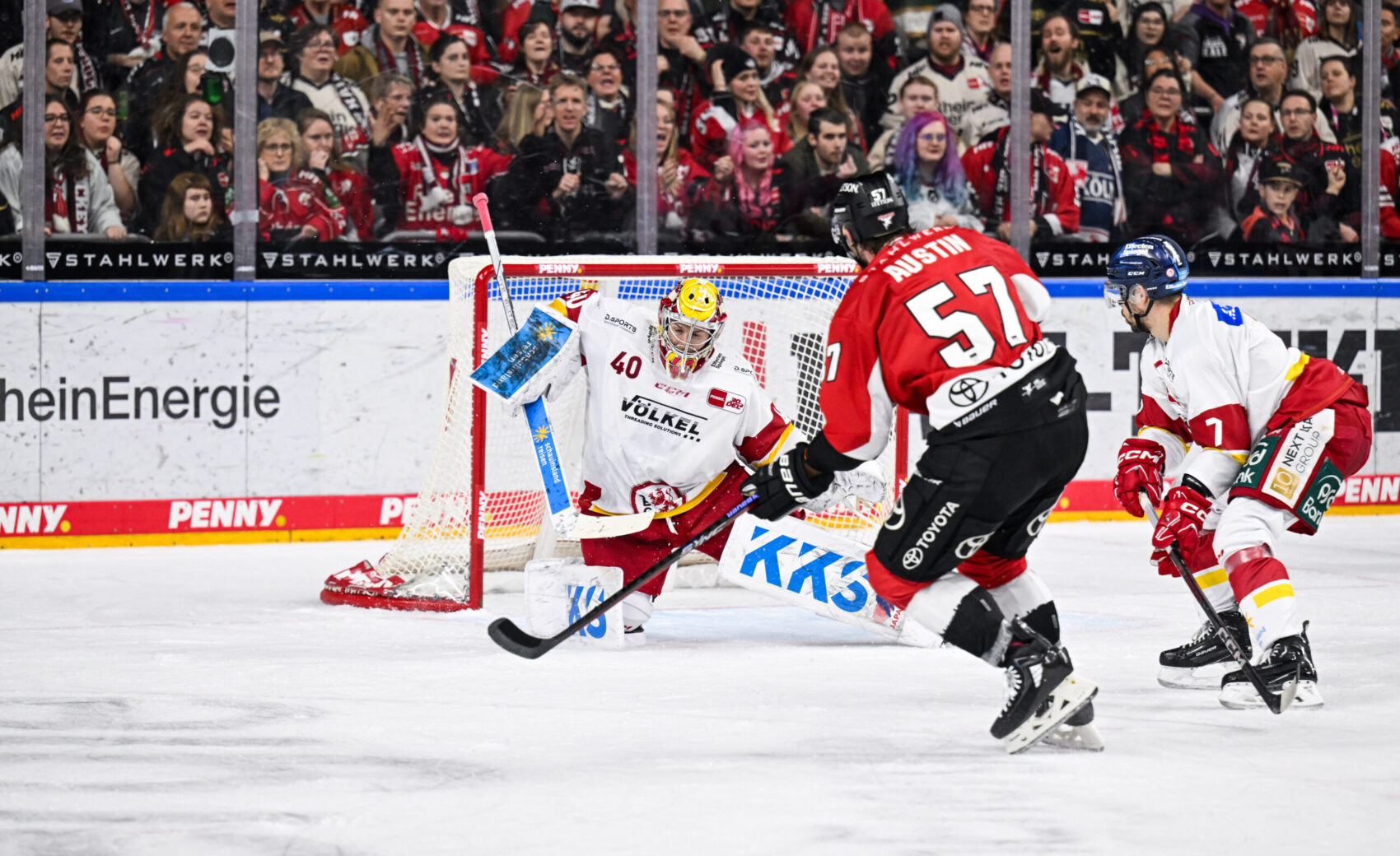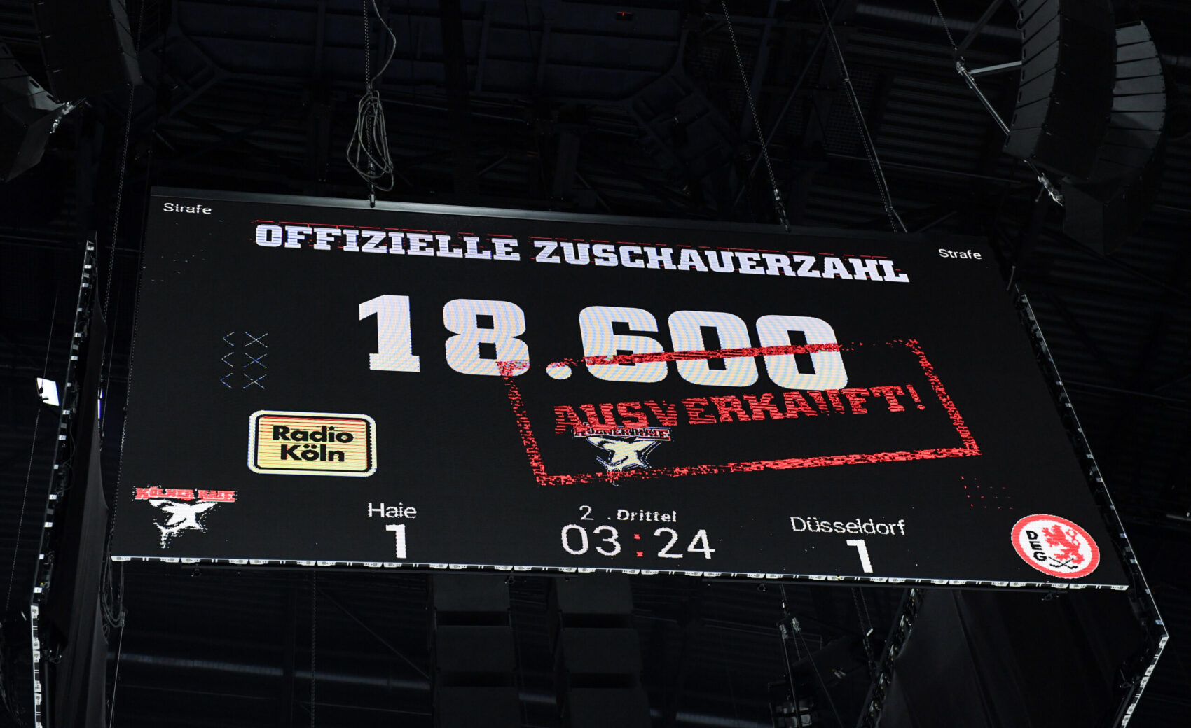 Vor 18.600 Zuschauern in der ausverkauften LANXESS arena schenkten sich beide Teams von Beginn an nichts. Konzentrierte Defensivarbeit auf beiden Seiten sorgte allerdings dafür, dass im ersten Drittel keine Tore fielen. Einem frühen Tor am nähesten kam David McIntyre in der elften Minute, doch der Schuss unseres kandischen Assistenz-Kapitäns zischte knapp am Tor von DEG-Goalie Henrik Haukeland vorbei. Auf der Gegenseite hatte Gäste-Akteur Alexander Ehl die beste Gelegenheit der ersten zwanzig Minuten für die DEG – sein Schuss traf nur das Auennetz.