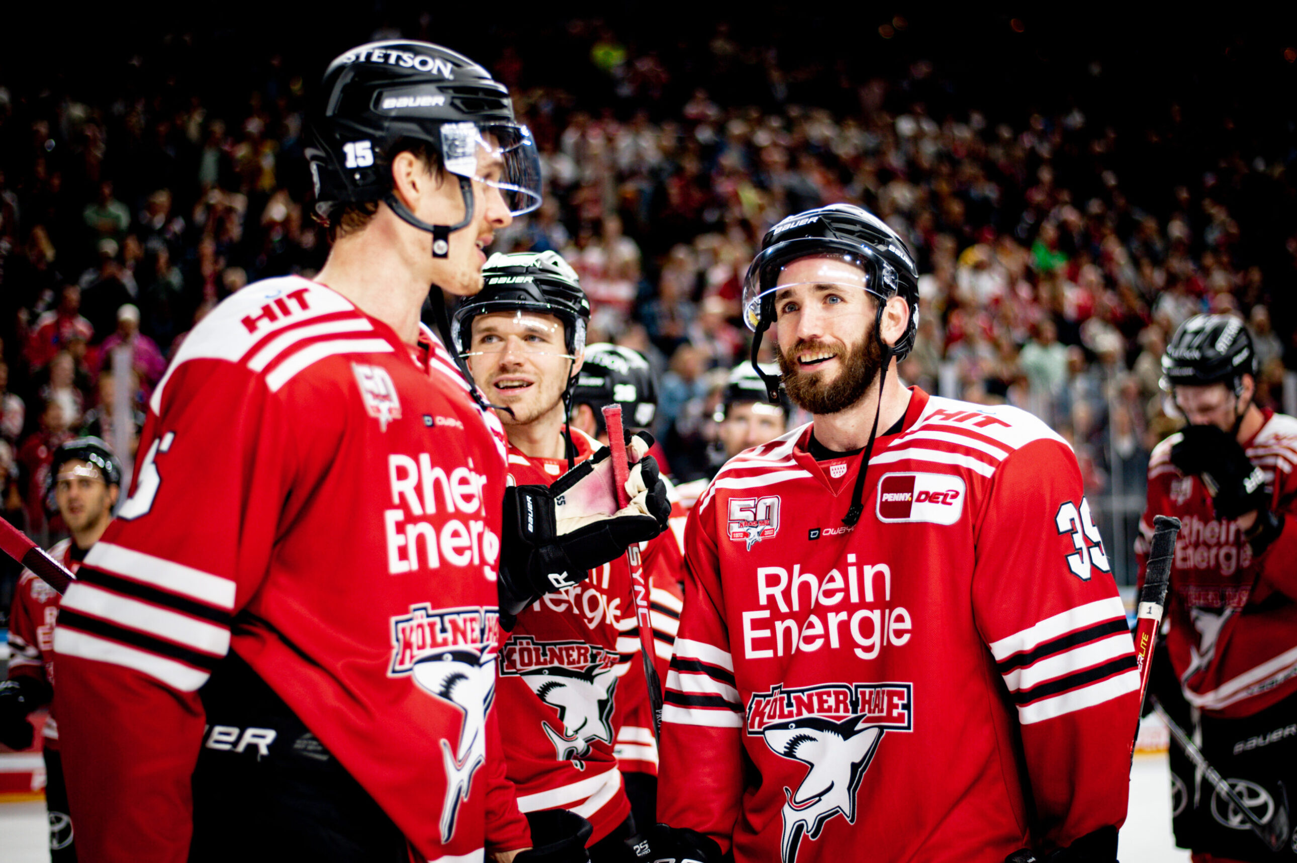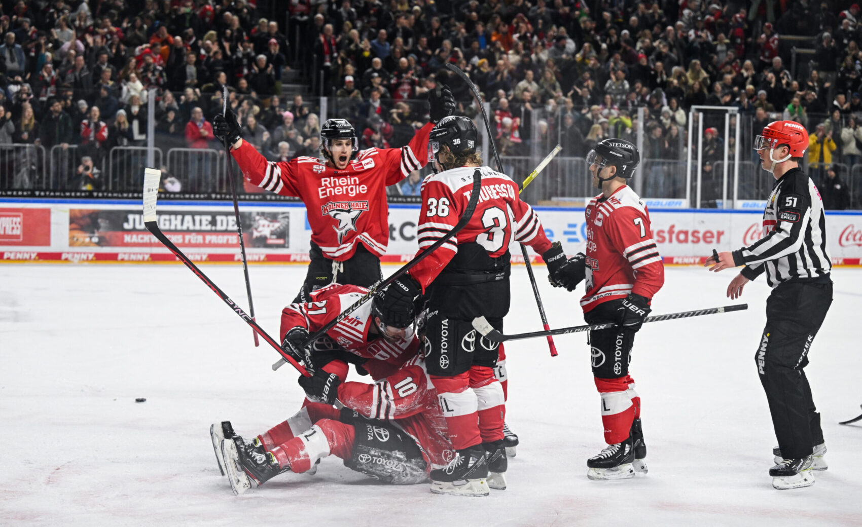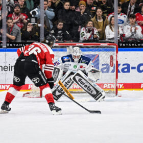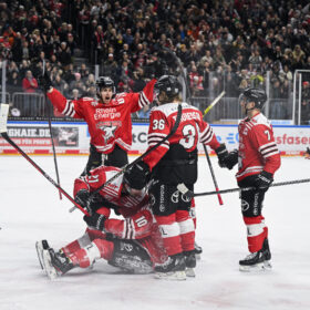 Und genau so kam es auch – niemand hielt es in den Schlussminuten mehr auf den Sitzen. Der Groteil der 10.842 Zuschauer peitschte die Haie in jedem Shift nach vorne, mit Erfolg! Der nimmermüde Jon Matsumoto verwertete einen Abpraller Weitzmanns halb im Stehen, halb im Fallen zum 3:3 (59.). Auf dem Boden liegend entwickelte sich eine Jubeltraube von sechs Haie-Akteuren, wieder hatte Krupp „Pante“ vom Eis geholt. Das Haifischbecken explodierte. Das gefährlichste PENNY DEL-Team des letzten Drittels hatte einmal mehr eindrucksvoll zurückgeschlagen und unfassbare Moral bewiesen.