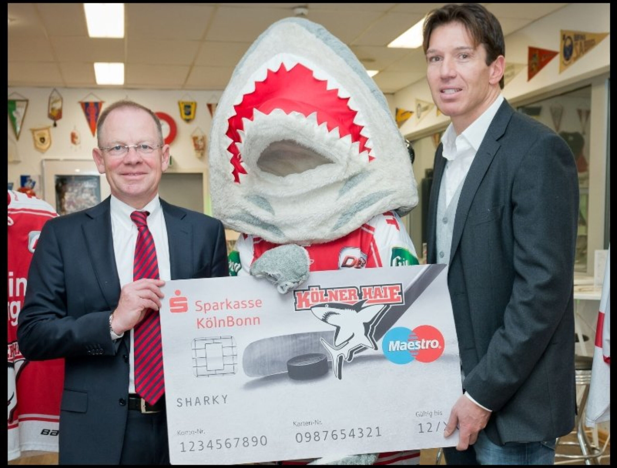 Die Sparkassen-HaieCard wurde am Donnerstag von Dr. Christoph Siemons, vom Vorstand der Spar¬kas¬se KölnBonn und Haie-Cheftrainer Uwe Krupp im Haie-Zentrum in Köln-Deutz vorgestellt. Symbolisch bekam KEC-Maskottchen Sharky die erste Sparkassen-HaieCard überreicht.