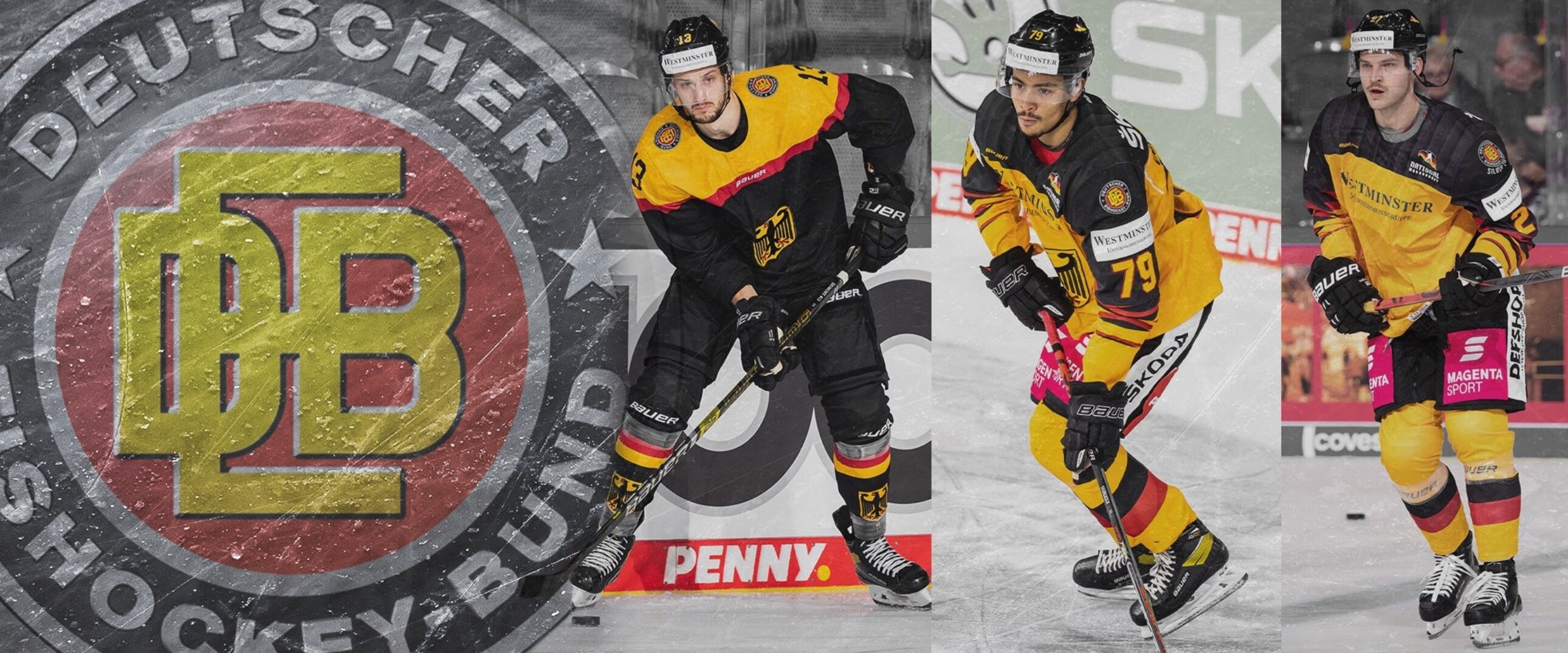 Im Bild: Lucas Dumont, Colin Ugbekile und Sebastian Uvira (v.l.) im DEB-Trikot (City-Press GmbH)