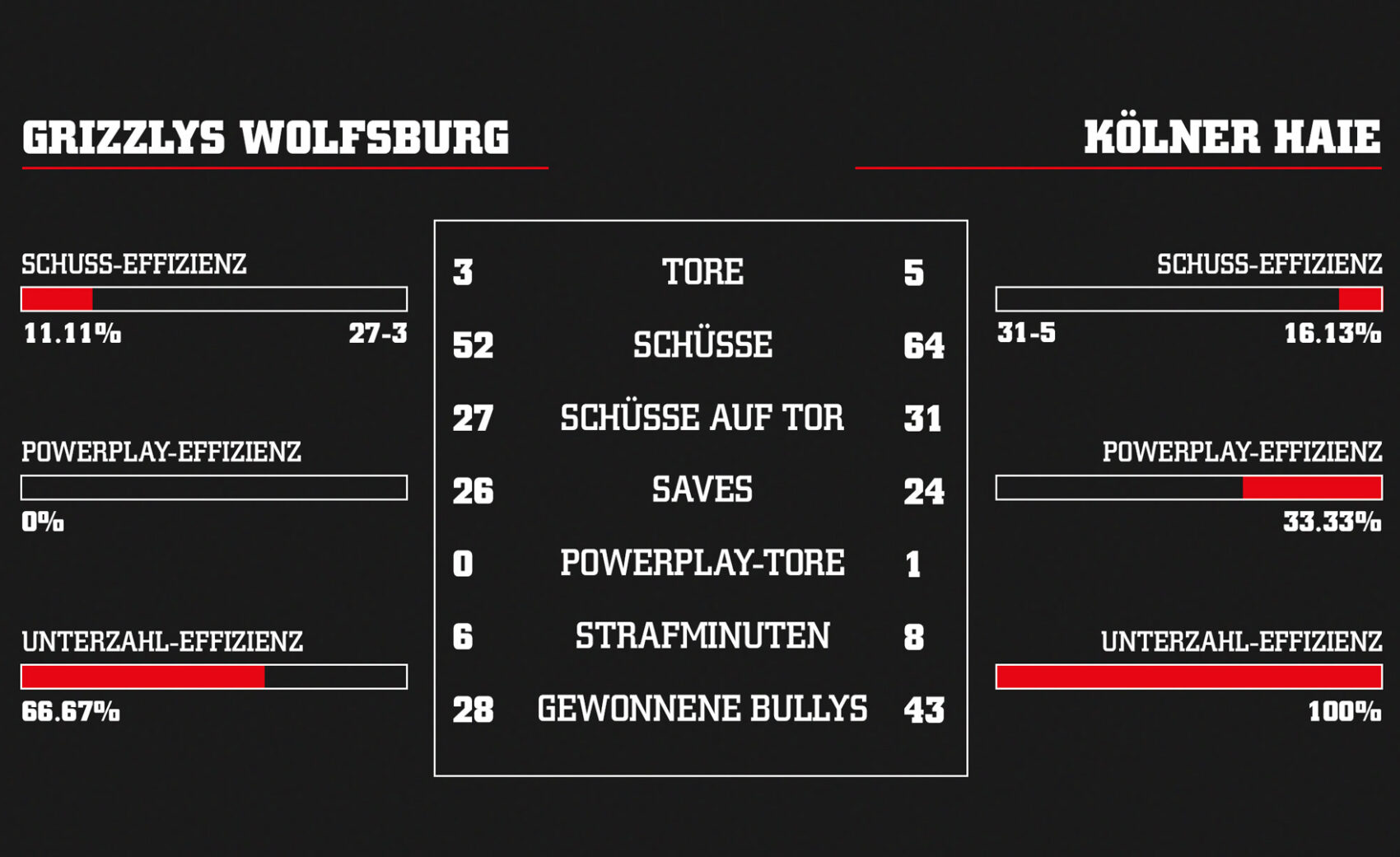 - Schussgewaltig: Die Haie sind die Mannschaft mit den meisten Schüssen der Liga. Dies zeigten sie auch in Wolfsburg mit 64 Schüssen, davon 31 auf das Grizzlys-Gehäuse.