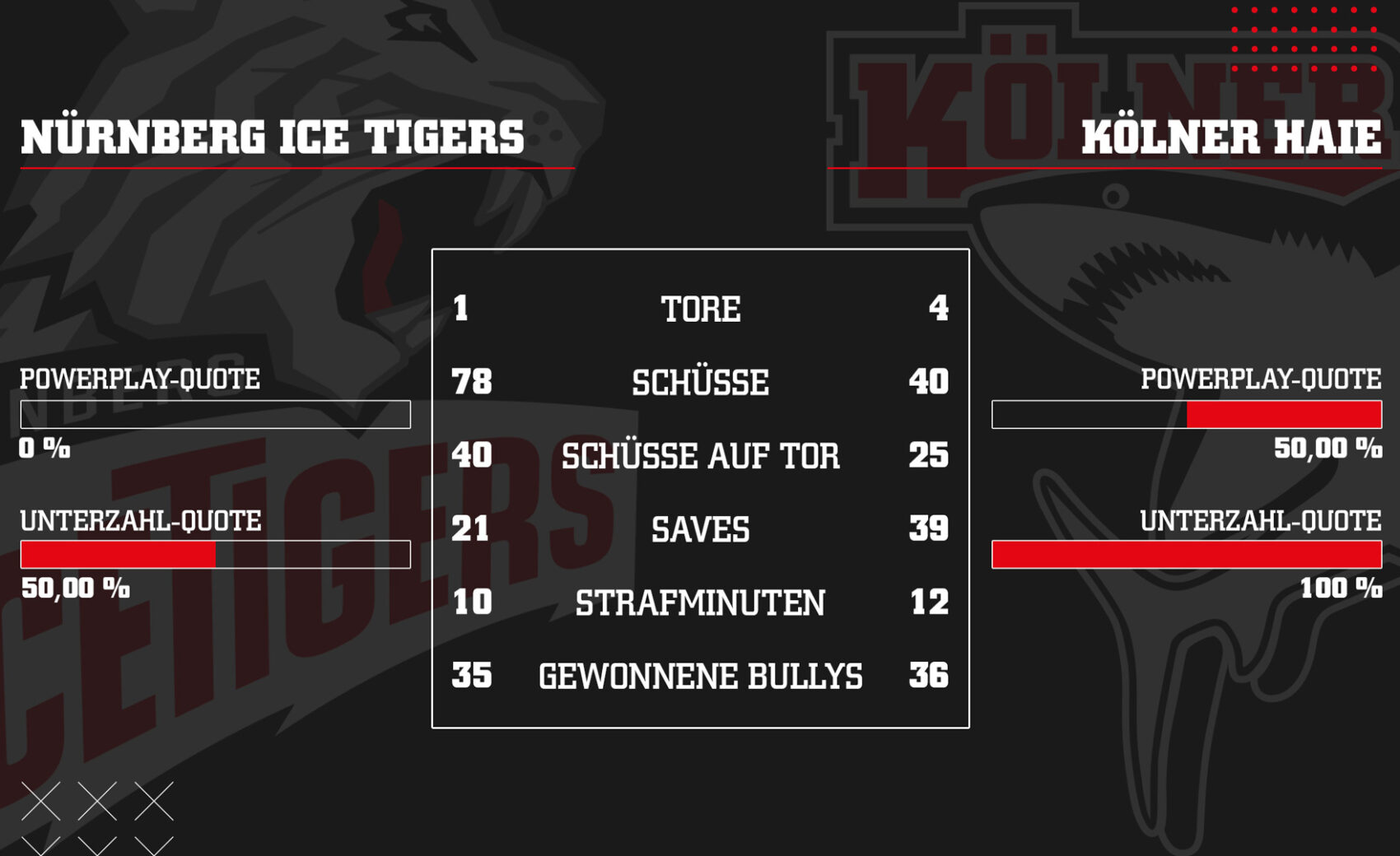 Den Schwung des Anschlusstreffers nahmen die Gastgeber auch mit in den Schlussabschnitt. Unsere Mannschaft konzentrierte sich derweil in den verbliebenen Minuten auf das Verteidigen. In einer frühen Überzahl hatten Tim Wohlgemuth gleich zweifach eine gute Abschlusschance, verpasste jedoch den vierten Haie-Treffer. Anschlieend drückten die Ice Tigers unsere Mannschaft mehr und mehr in die Defensive. Ein weiterer Treffer sollte ihnen dank des stark aufgelegten Ancickas und einer konzentriert verteidigenden Kölner Hintermannschaft nicht mehr gelingen. Mark Olver traf dagegen vier Sekunden vor dem Ende ins verwaiste Nürnberger Gehäuse und stellte somit den 4:1-Endstand aus KEC-Sicht her.