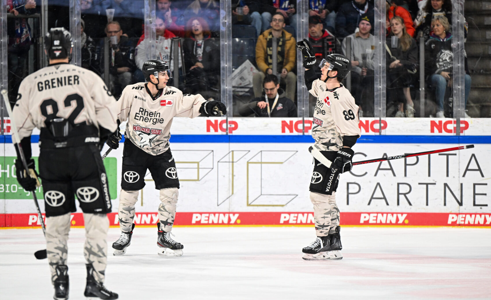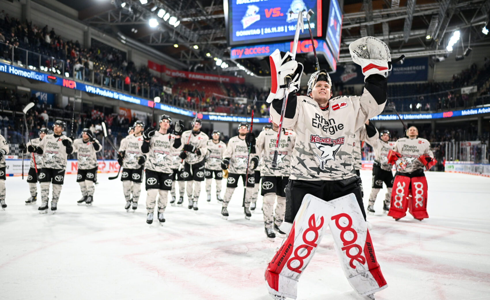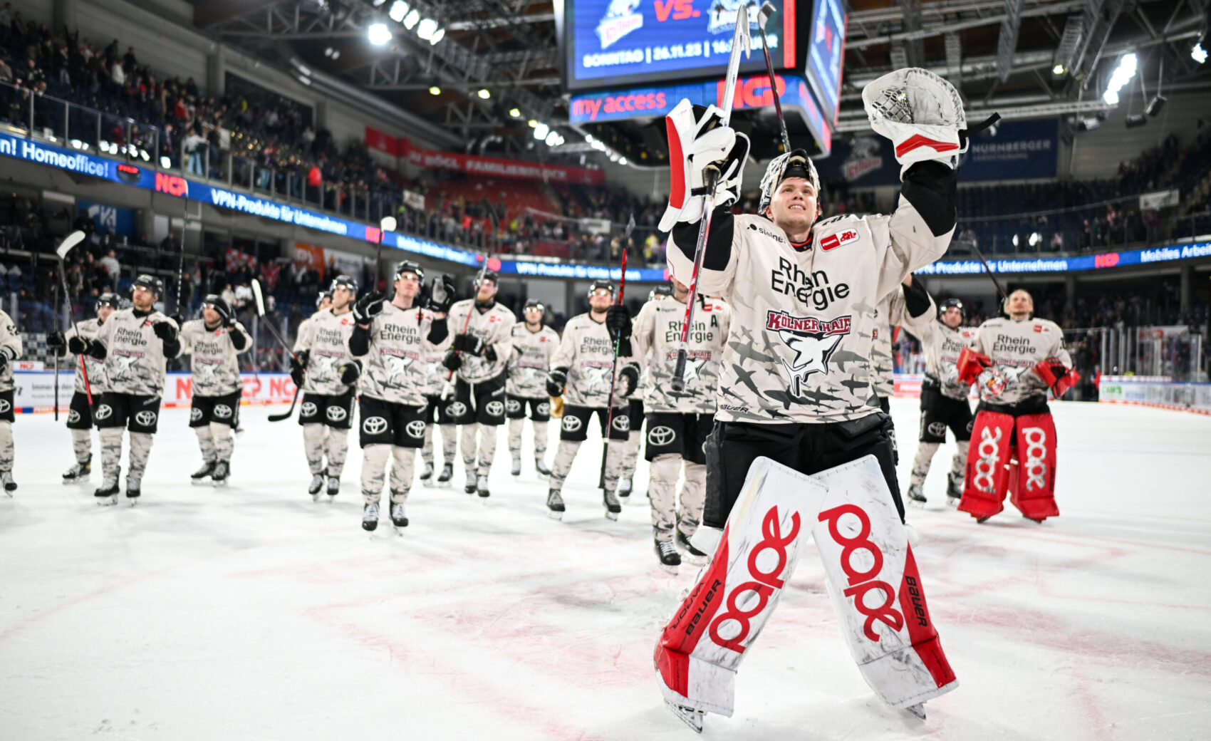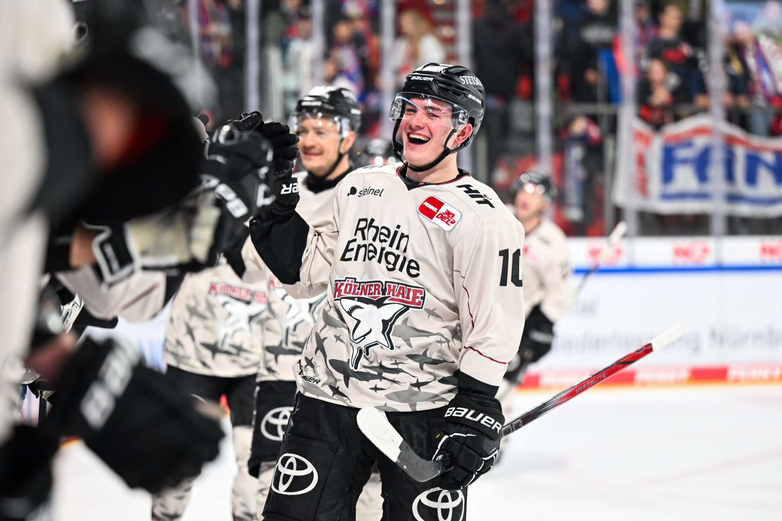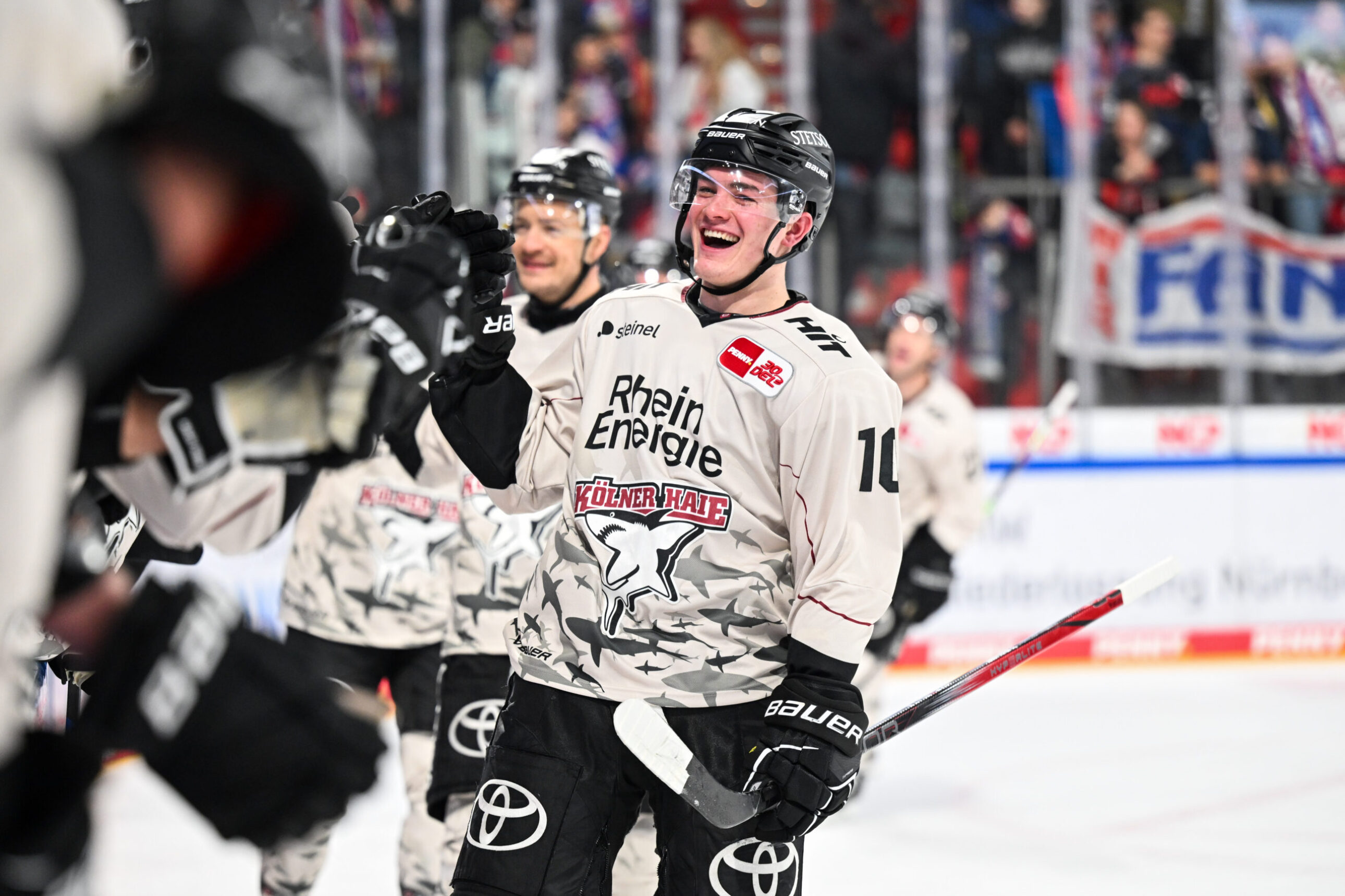 Etwas verhaltener ging es dann in den zweiten Abschnitt. In der 25. Minute hatte Louis-Marc Aubry per Rückhand die erste gute Gelegenheit, kam aber nicht an Nürnbergs Goalie Leon Hungerecker vorbei. Kurz darauf landete die Scheibe dann im Nürnberger Kasten. Grenier, von MacLeod bedient, scheiterte zunächst an Hungerecker, doch die Scheibe kullerte anschlieend über die Linie. Vorher wurde die Partie allerdings schon unterbrochen, weshalb der Treffer keine Anerkennung fand. Angetrieben von diesem nicht gegebenen Tor sorgte unsere Mannschaft keine zwei Minuten später für das 2:0, was auch Bestand haben sollte. Nach schönem Querpass von Alexandre Grenier hatte Maxi Kammerer das halbe Tor offen und traf unter die Latte. Und damit nicht genug. Nur vier Minuten später erhöhte Justin Schütz, der die Scheibe aus dem Slot über Hungerecker hinweg bugsierte, auf 3:0 aus Haie-Sicht. Zuvor verpassten bereits Mark Olver und Jan Luca Sennhenn den dritten Kölner Treffer. Aber auch die Ice Tigers sollten im zweiten Drittel zum Torerfolg kommen. Einen Schuss von der blauen Linie fälschte Stoa unhaltbar für Ancicka ab.