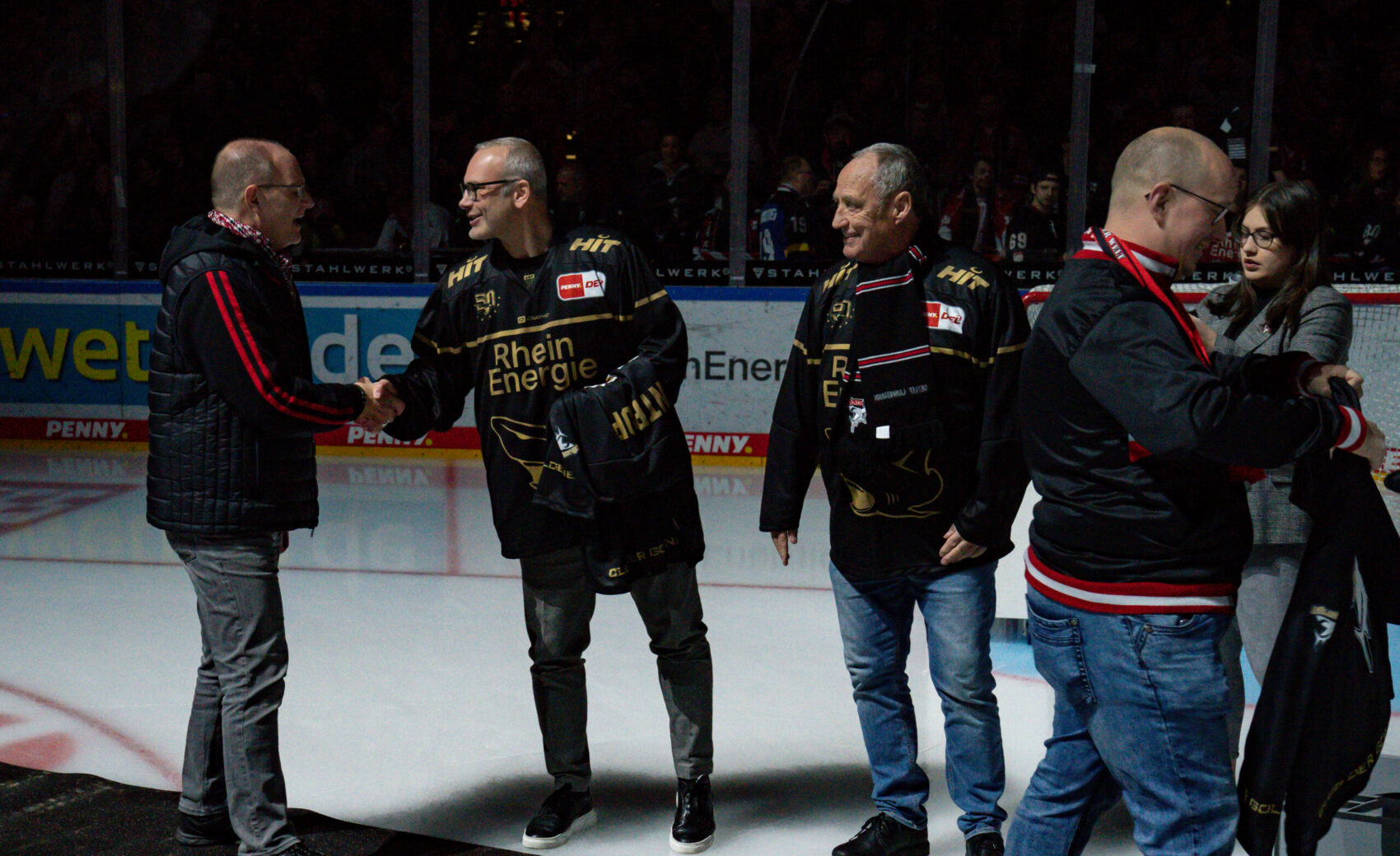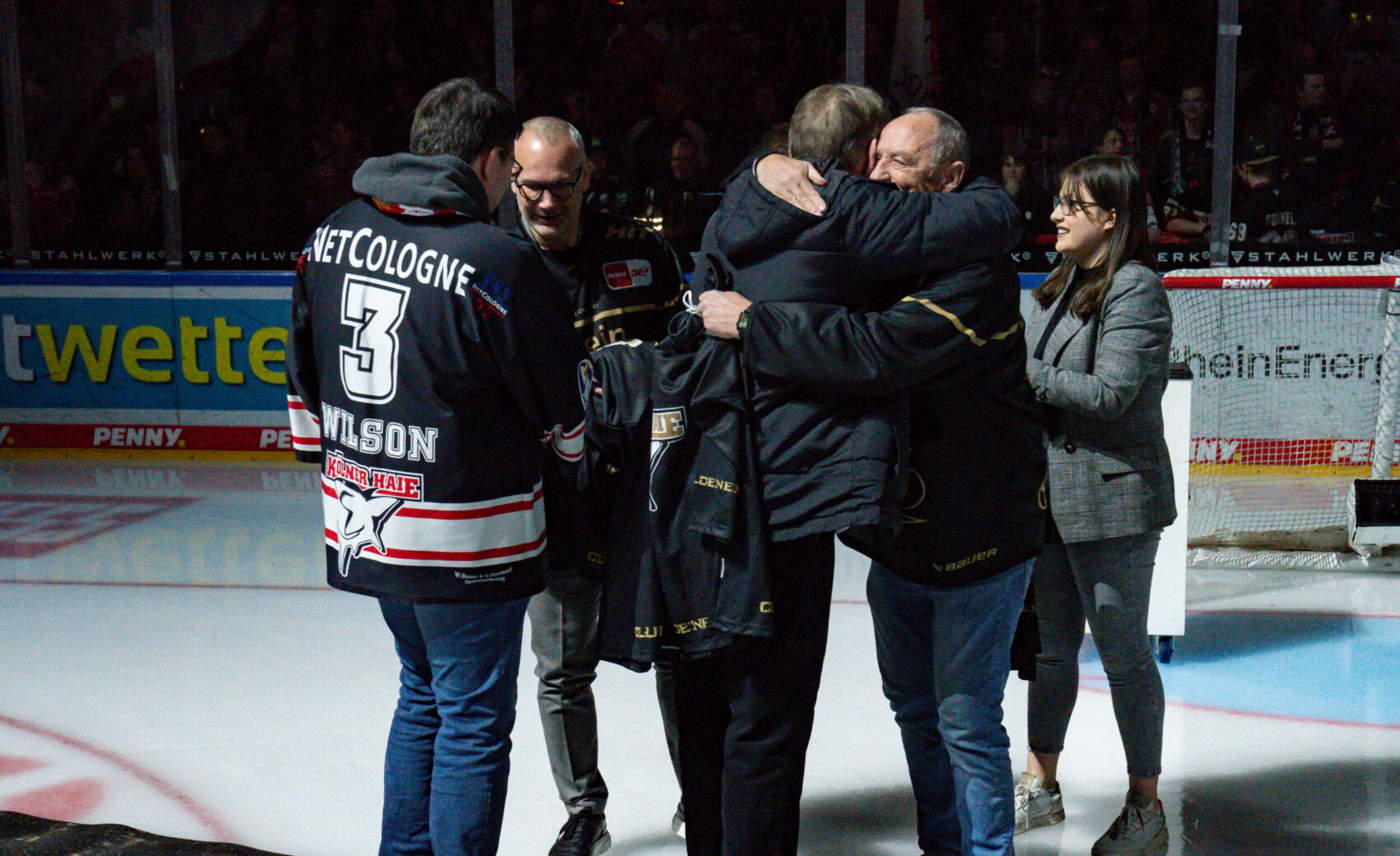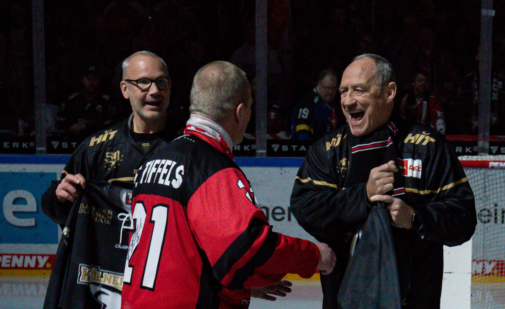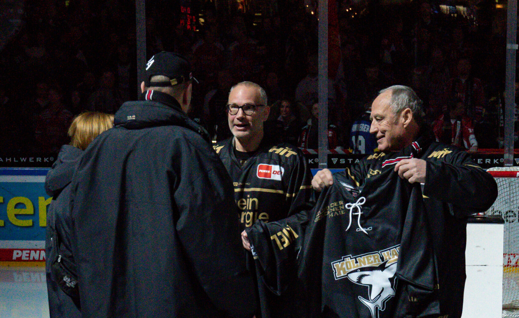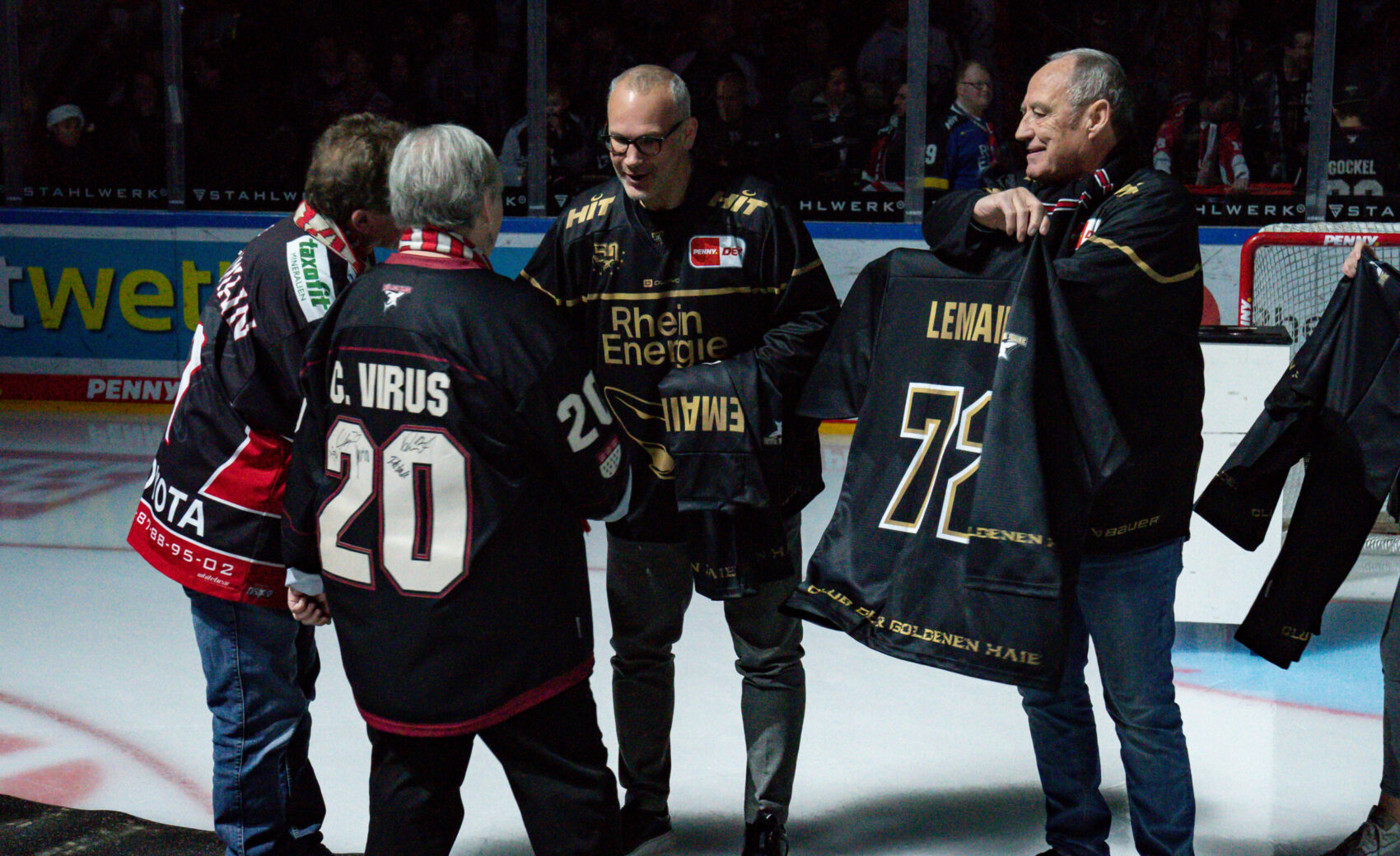 Die neuen Mitglieder des besonderen Clubs durften, wie kurz danach die KEC-Profis, durch das Hai-Maul das Eis betreten. Anschließend bekamen sie von Haie-Rekordspieler Mirko Lüdemann und KEC-Gründungsvater Detlef Langemann ihr persönliches Ehrentrikot überreicht. Da die Ehrung in den vergangenen Jahren ausgefallen ist, wurden in diesem Jahr die Verleihung aus den vergangenen Spielzeiten mit nachgeholt.