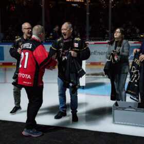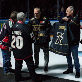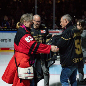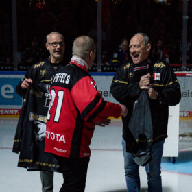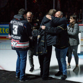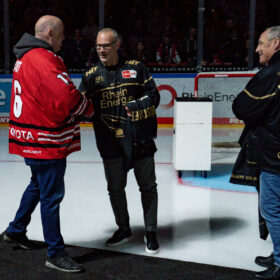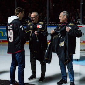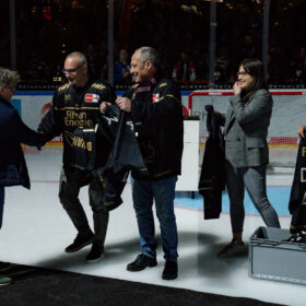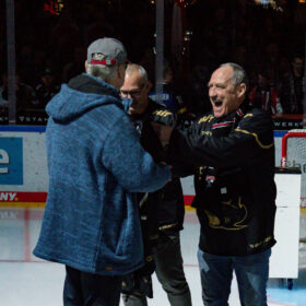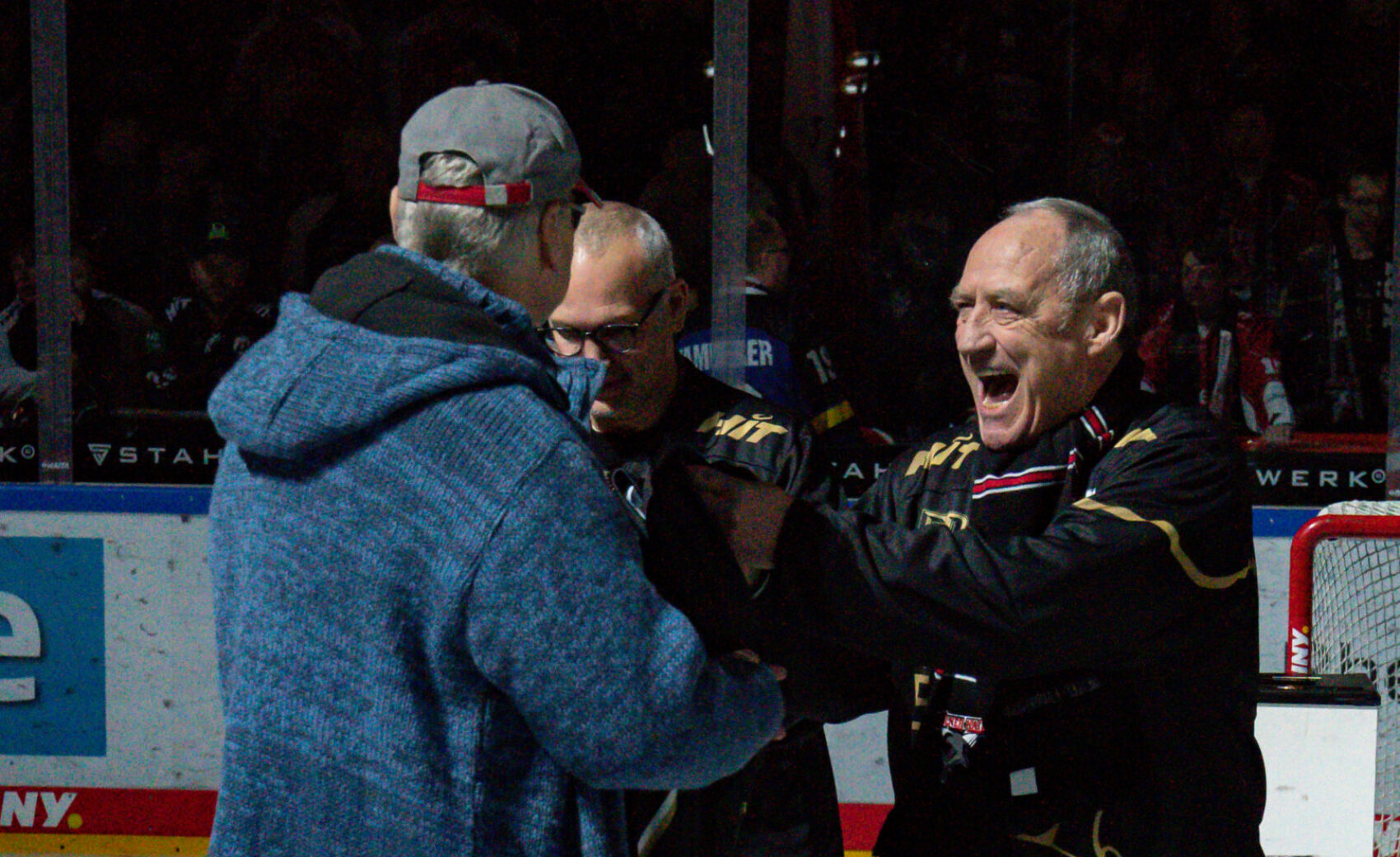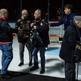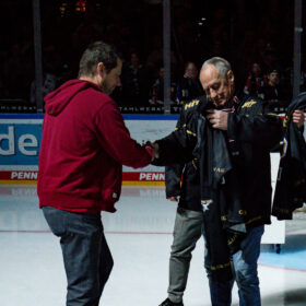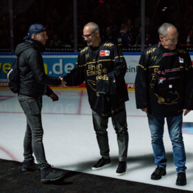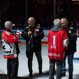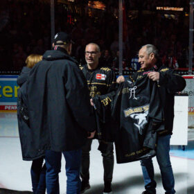 Der „Club der Goldenen Haie“ ist um 38 Fans angewachsen! Vor dem sonntägigen Heimspiel wurden die treusten der treuen Haie-Fans auf dem Eis geehrt.