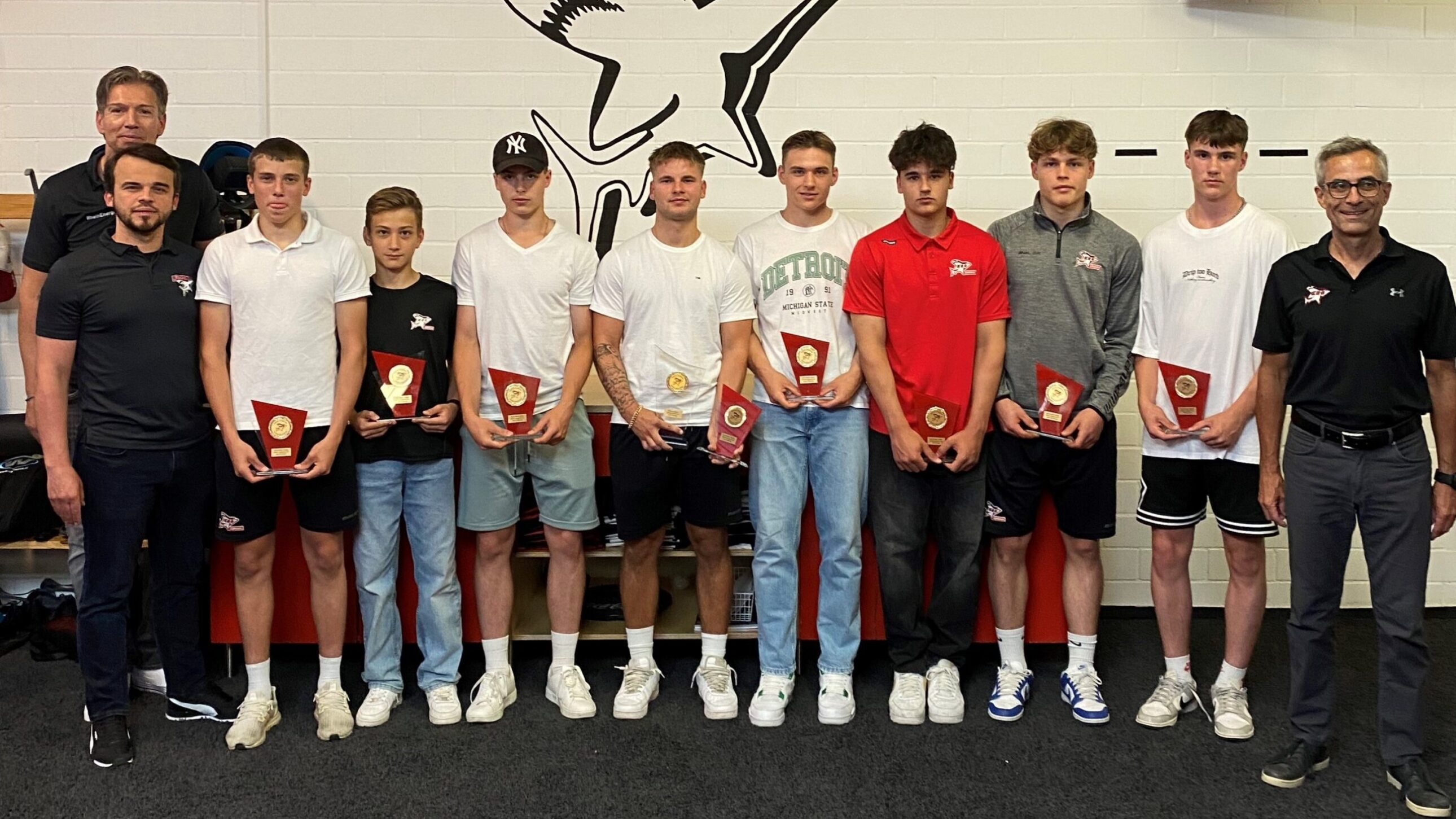 Zusammen mit Rodion Pauels, dem Geschäftsführer und sportlichen Leiter der Junghaie, ehrten Krupp und Baldys die wertvollsten Junghaie der Altersklassen U15, U17 und U20 der abgelaufenen Saison. Die Ehrung fand in der Kabine der Profis in der KA2 statt – seit nun mehr 23 Jahren findet sie zum Ende einer jeden Saison statt und besitzt beim KEC und den Junghaien daher eine groe Tradition. Den Anfang machte die Ehrung zur Spielzeit 1999/2000. Und nach genau dieser Saison wurde der heutige Sportdirektor Matthias Baldys als wertvollster Spieler der Jugendmannschaft geehrt.
