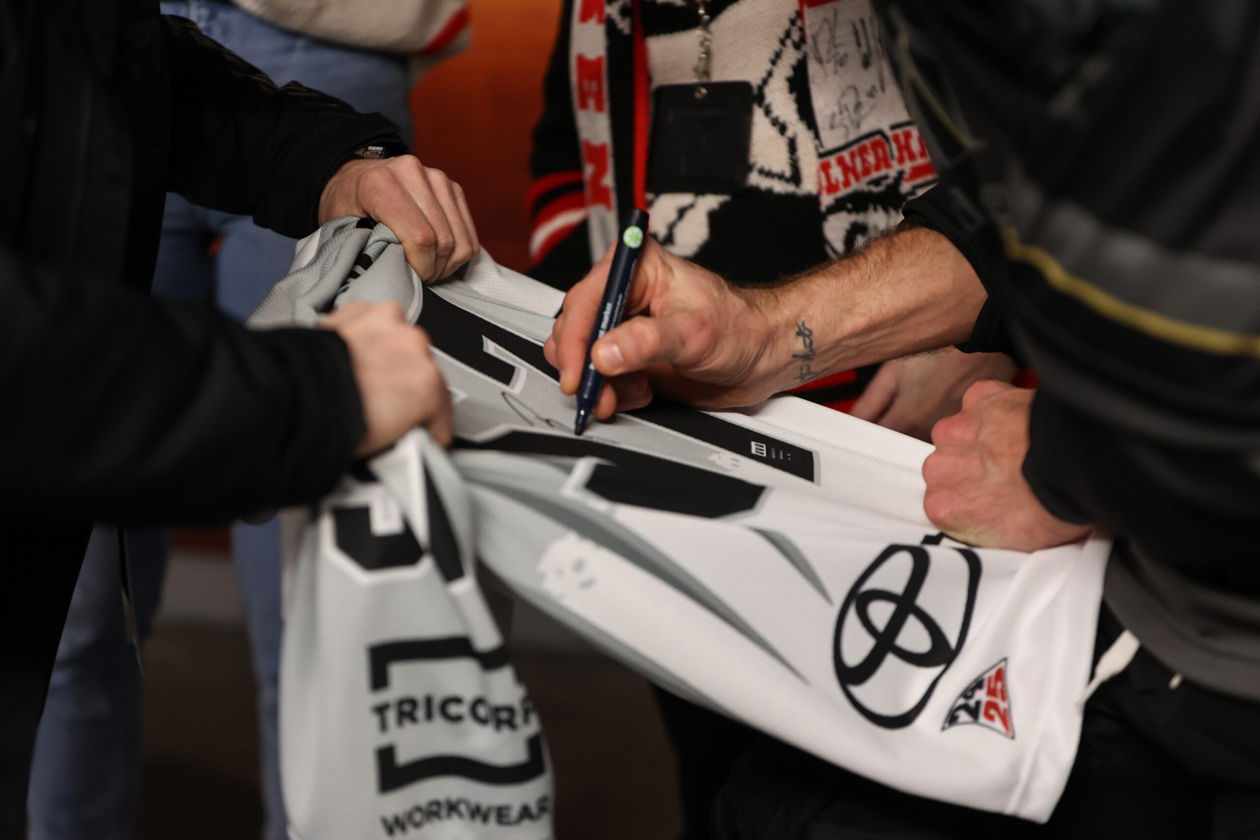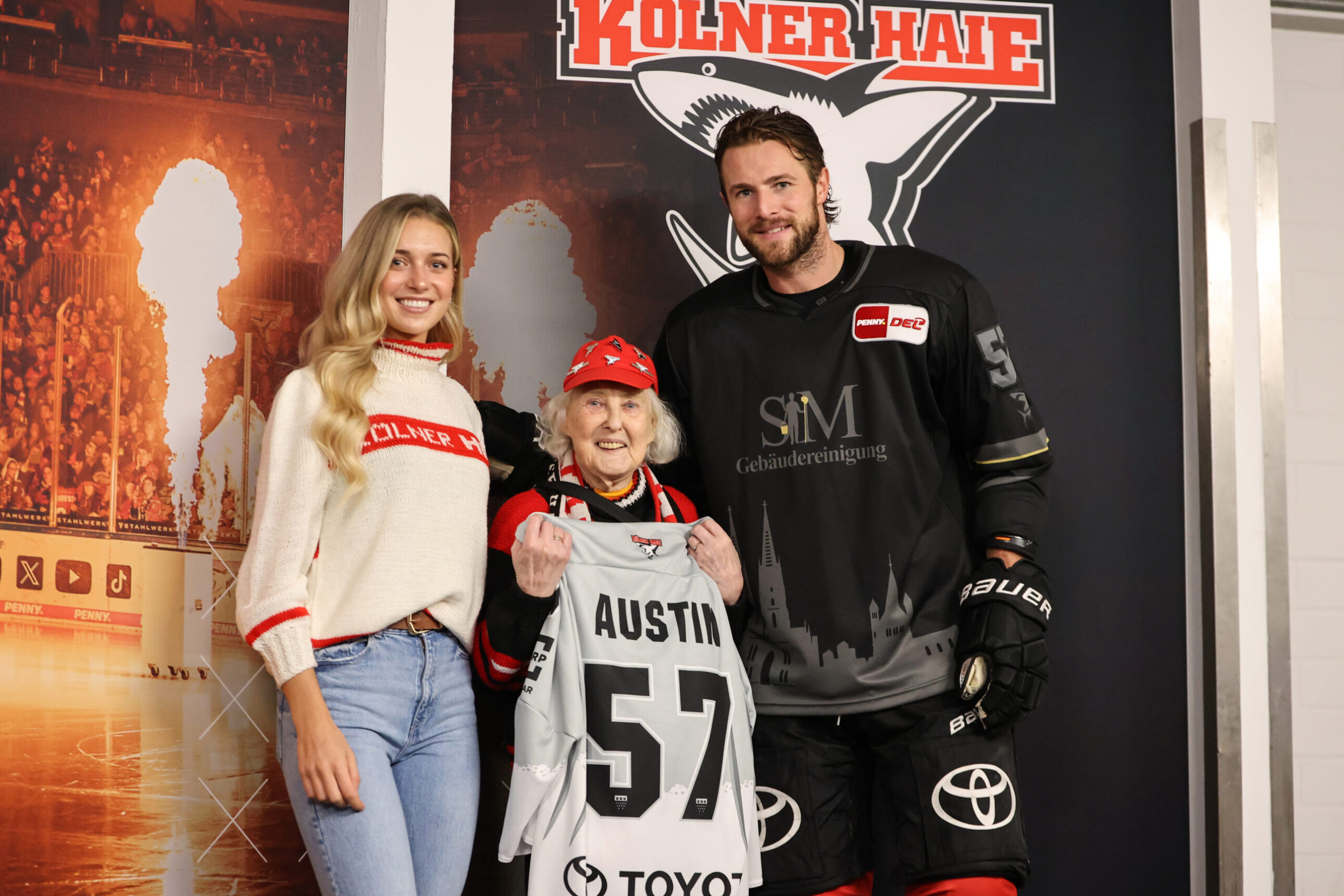 „Romy ist einzigartig. Wir kennen sie, weil sie bei fast jedem Training auf der Tribüne sitzt und uns immer positiv zugewandt ist – sie sitzt immer auf ihrem Stammplatz, winkt uns, wenn wir auf das Eis kommen und sorgt bei uns für gute Laune“, so unsere Nummer 57 über Romy. Und Brady Austin war es zusammen mit seiner Frau Braedyn ein Anliegen, den Pullover nicht einfach so entgegenzunehmen.