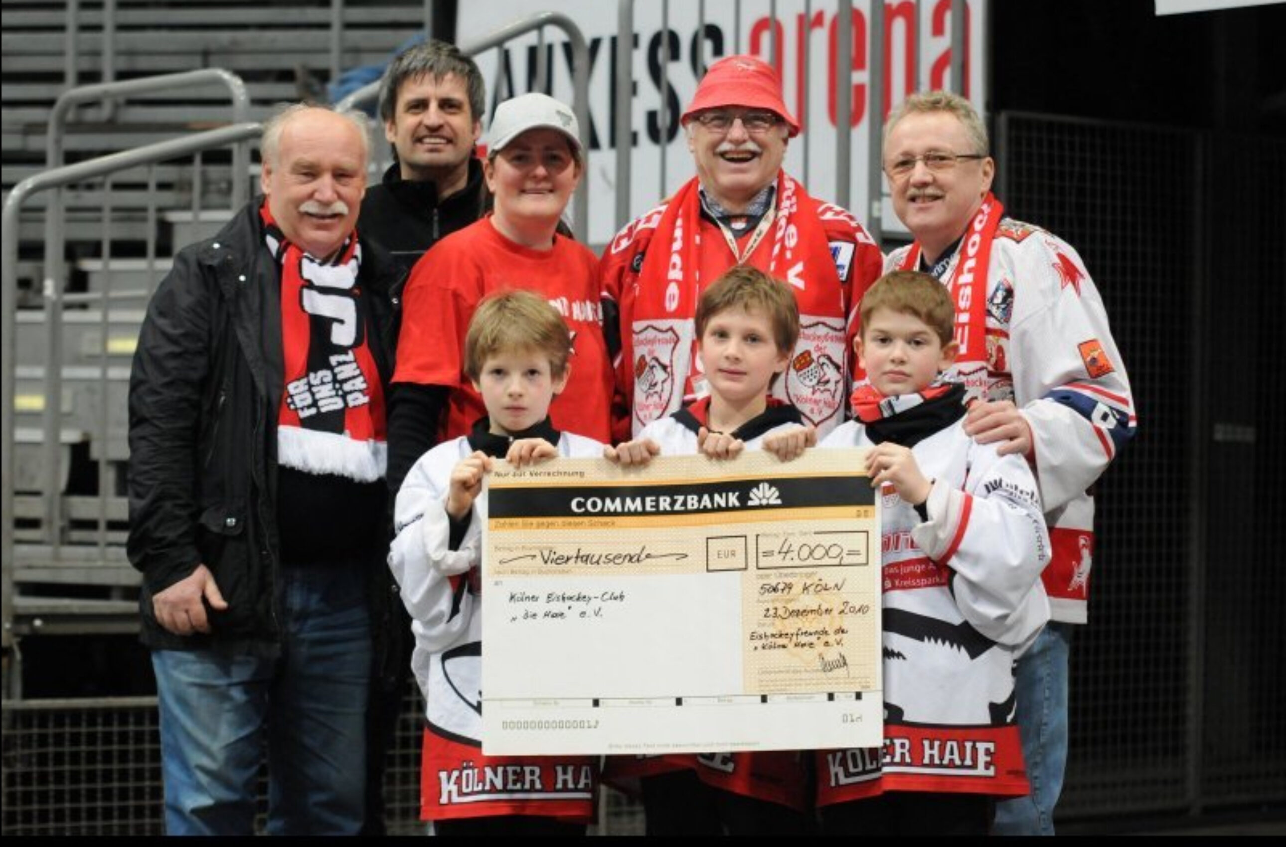 Der Haie-Fanclub „Eishockeyfreunde der Kölner Haie e.V.“ hat einmal mehr seine Großzügigkeit unter Beweis gestellt. Der Fanclub hat dem Nachwuchs des KEC einen Scheck über € 4.000,- übergeben.